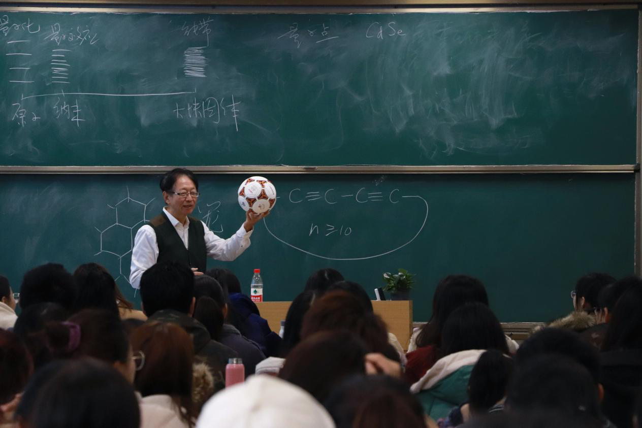 而讲到杂化轨道时,郑兰荪更是巧妙利用足球教具展示了五元环和六元环在C60中的结构关系,揭露了隐藏在C60凸多面体中的欧拉定理。随后,他又以我国的国防建设作为例子,指出氮元素的重要性。郑兰荪告诫在座师生:“化学学习要与数学和实践相结合,要把化学问题放到生活中研究。”