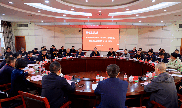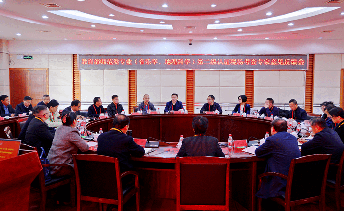 12月6日至12月9日,教育部师范类专业认证专家组对beat365官网音乐学、地理科学专业进行二级认证进校考查。齐鲁师范学院党委书记林松柏教授担任联合认证专家组组长兼音乐学专业专家组组长,西南大学王勇教授担任地理科学专业认证专家组组长。音乐学专业认证专家组成员由安锦莉正高级教师、张寅教授、苗金海教授、康爱琪教授组成,地理科学专业专家组成员由方小培正高级教师、冯年华教授、张胜前教授、张晓青教授组成,吴国华副研究员、张薇薇副教授任专家组秘书。安徽省教育评估中心负责人到现场指导。