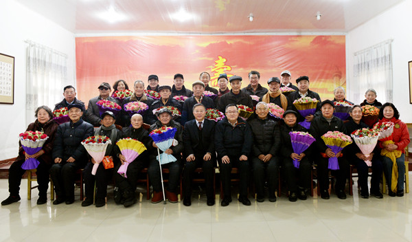 校党委书记许继荣同老寿星们一一握手,并将鲜花、寿糕送到老寿星们手中,为他们送来了最真诚、最温馨的祝福,祝福他们健康长寿,福如东海!