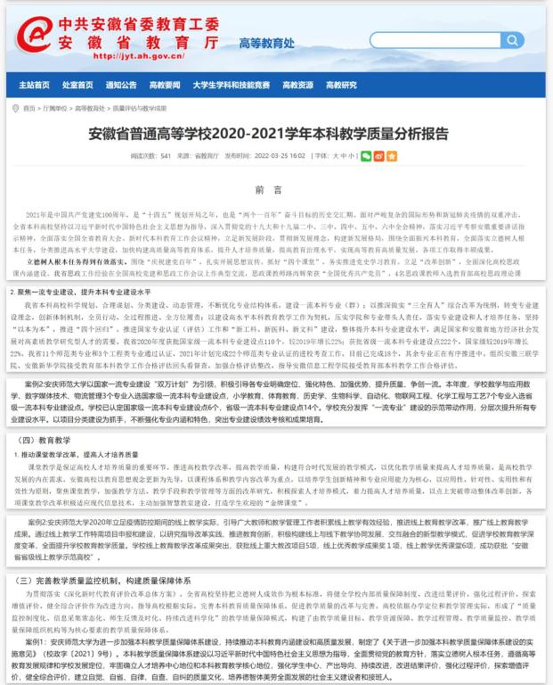 近日,安徽省教育厅发布《安徽省普通高等学校2020-2021学年本科教学质量分析报告》(以下简称《报告》),详细分析了全省高校本科教育教学的整体情况和高等教育高质量发展取得的丰硕成果。《报告》共遴选了全省30个本科高校共47个典型案例,beat365官网在专业建设、教育教学、质量保障三个领域入选3个典型案例,在全省高校中名列前茅。