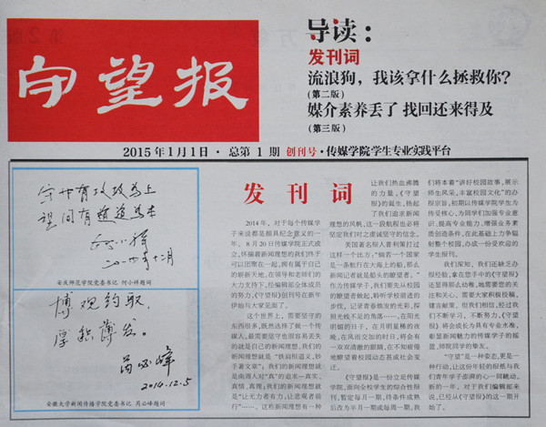 传媒学院学生专业实践平台——《守望报》已创办发行,校党委书记何小祥为报纸创刊号题词:“守中有攻攻为上,望间有道道为本”。