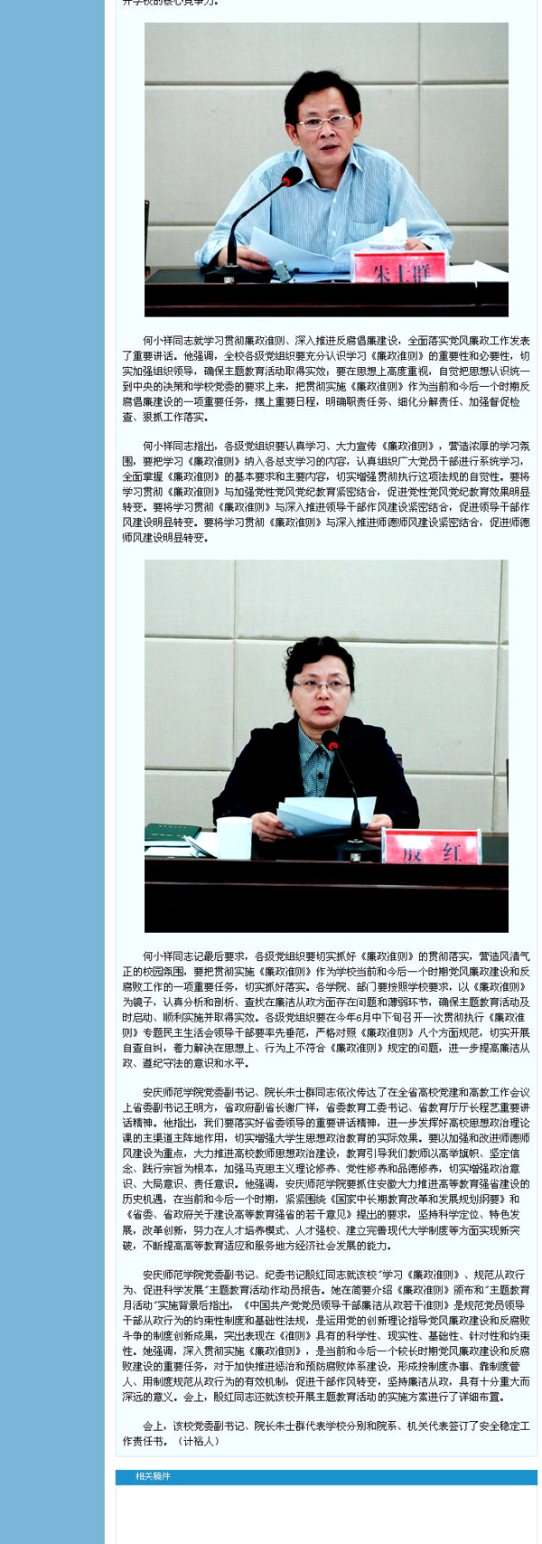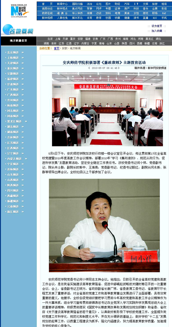 5月5日,beat365官网召开会议,传达贯彻第17次全省高校党建暨2010年度高教工作会议精神,部署2010年"学习《廉政准则》、规范从政行为、促进科学发展"主题教育活动。5月7日新闻经新华网发布后,立刻被中国网、网易、新民网等多家网站转载,产生了很大影响。省教育厅新闻网也于5月6日在网站首页进行了发布。