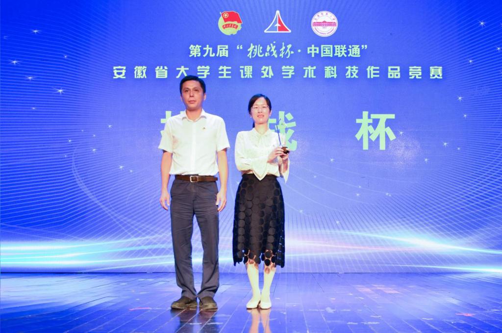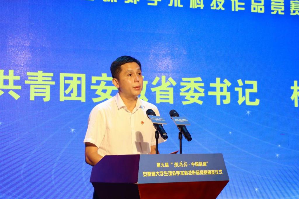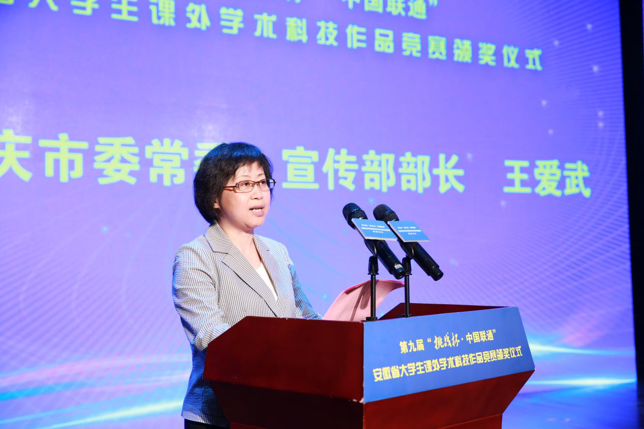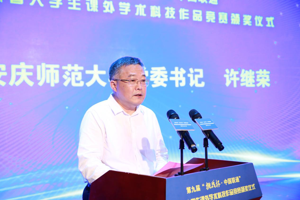 共青团安徽省委书记杨正,安徽省社会科学院党组成员、副院长杨俊龙,共青团安徽省委副书记胡靖,省教育厅学生处二级调研员夏军,省科协学会部副部长姚德祥,安徽省学生联合会主席徐杨清昕等主办单位负责人;beat365英国官网网站党委书记许继荣,党委副书记吴照明,党委常委、副校长汪时珍等承办单位负责人;中国联通安徽省分公司副总经理吴涛等协办单位负责人;中共安庆市委常委、宣传部部长王爱武出席大赛颁奖仪式。获奖高校师生代表200余人参加颁奖仪式。