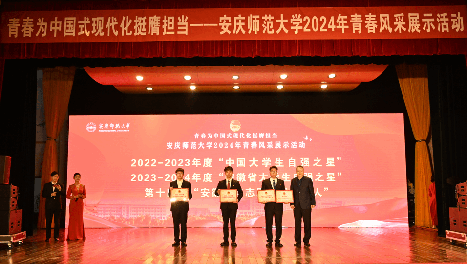 活动现场还集中展示了校“创新创业之星”“志愿服务之星”“优秀青年”“十佳青年”,安徽省第十届“挑战杯”竞赛、安徽省第七届大学生艺术展演、安徽省2023年暑期“三下乡”社会实践活动获奖项目、集体及个人,2022-2023年度“中国大学生自强之星”、2023-2024年度“安徽省大学生自强之星”、第十四届“安徽青年志愿者优秀个人”的风采。(撰稿:徐自宇 刘子阳 摄影:范龙超 姚梦婷 编辑:江伟 审核:汪洋 陈秀)