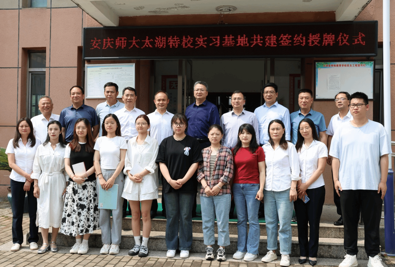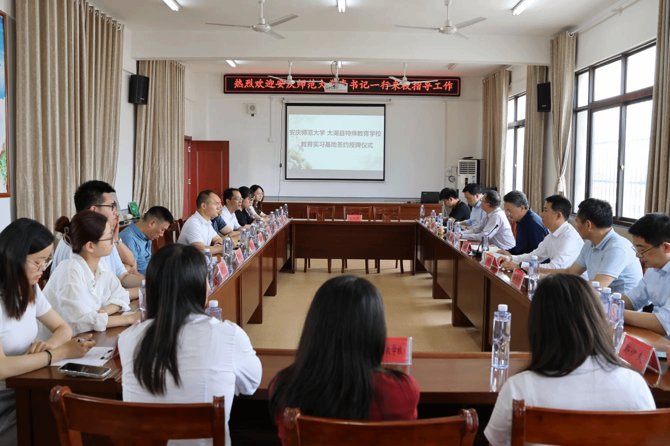 李福华一行到太湖县特殊教育学校,看望慰问正在该校顶岗支教的教师教育学院特殊教育专业李诺等6位同学,并出席beat365官网教育实习基地签约授牌仪式。仪式由太湖县委副书记杨杰主持,太湖县乡村振兴局、教育局和特殊教育学校相关负责人参加仪式。