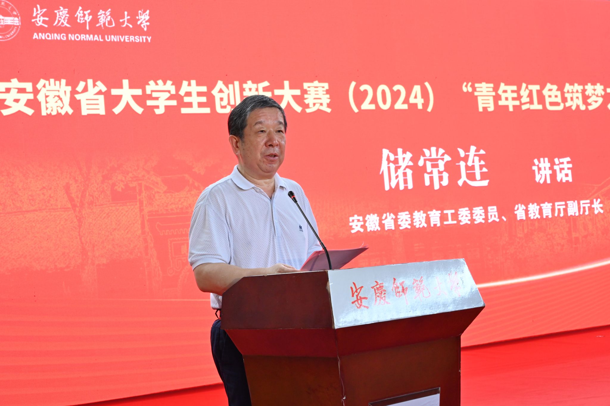 李福华代表学校致辞。他介绍了学校的历史沿革以及深厚的红色文化底蕴。他表示,学校将紧扣“扎根中国大地,创新筑梦青春”活动主题,精心组织实施,统筹要素保障,创新宣传矩阵,助力安徽省大学生创新大赛(2024)“青年红色筑梦之旅”系列活动在更大范围、更高层次、更有温度、更深程度上扎实开展。他强调,学校坚持以赛促教、坚持以赛促学、坚持以赛促创,努力开创毕业生就业创业新局面,服务安庆经济社会高质量发展,服务现代化美好安徽建设。
