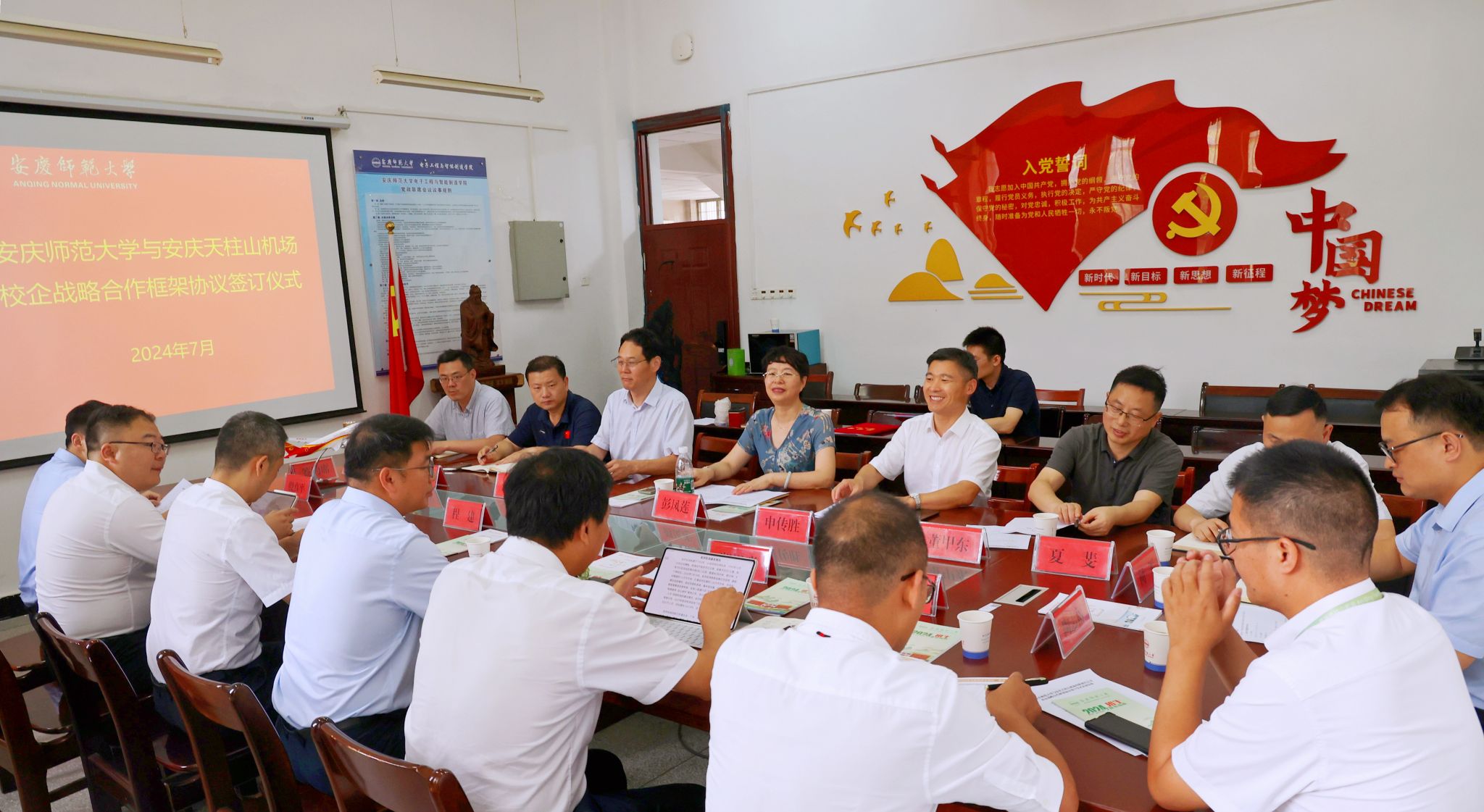 7月17日,安庆天柱山机场有限责任公司董事长刘善斌一行来校调研考察。校长彭凤莲出席座谈会,校党委常委、副校长申传胜主持会议。