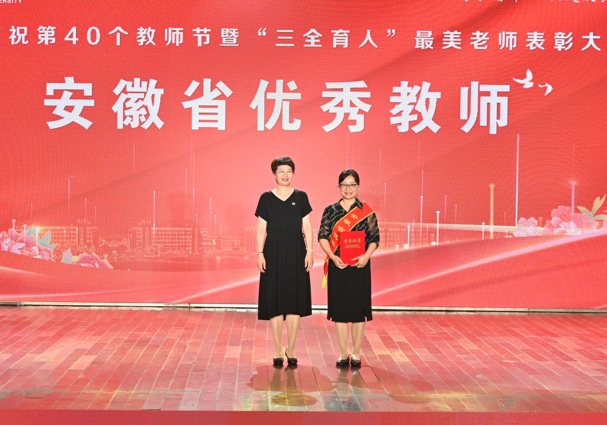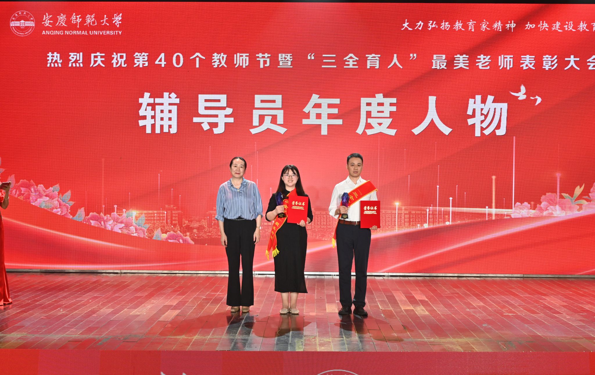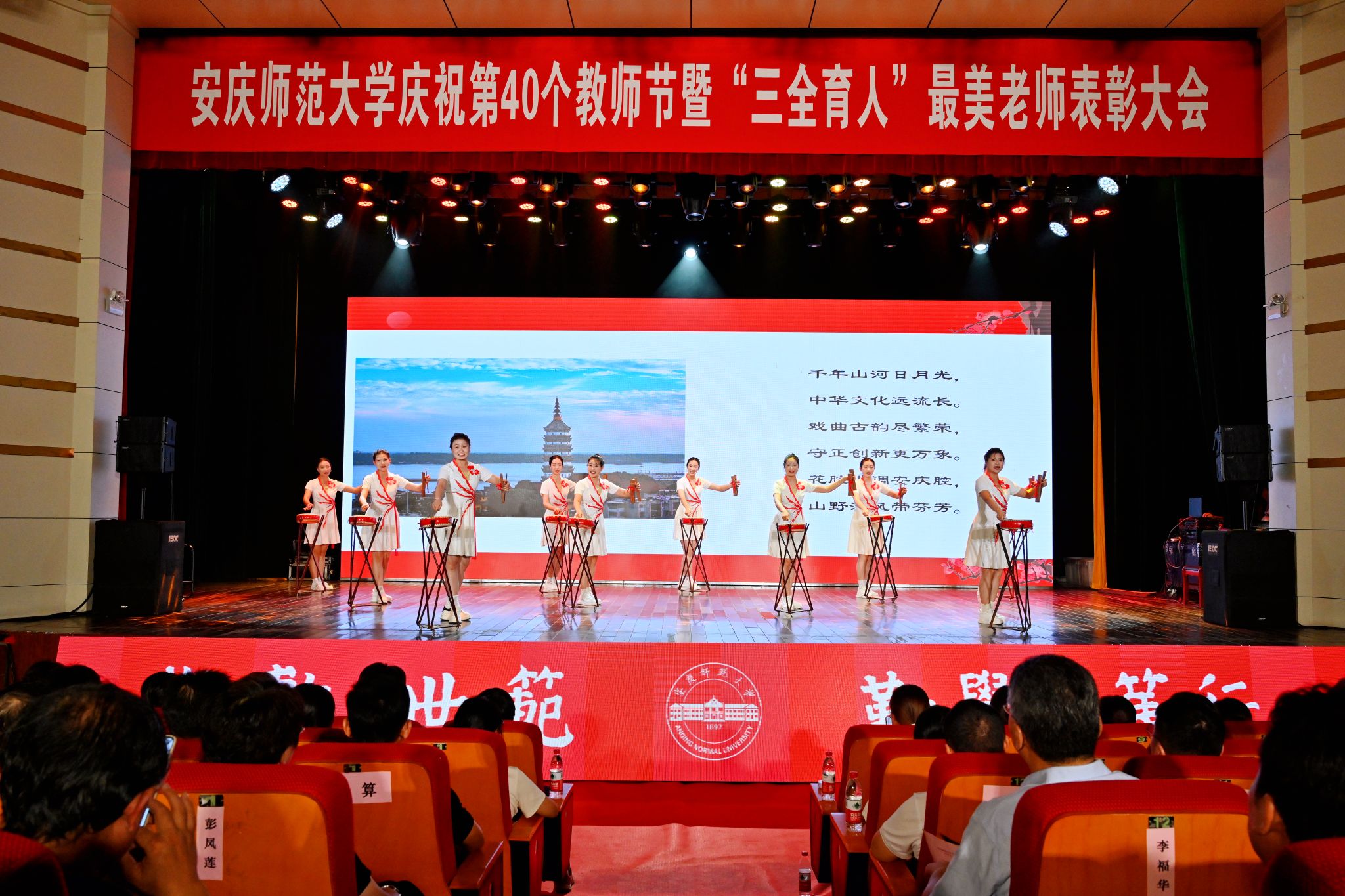 春华秋实硕果盈枝,韶华灼灼桃李芬芳。9月10日,学校在龙山校区音乐厅举行庆祝第40个教师节暨“三全育人”最美老师表彰大会。校党政领导李福华、彭凤莲、崔明、刘友忠、吴琼、肖新、秦朗、申传胜、陈秀、张红飞、计裕人出席大会。全体获奖教师和师生代表欢聚一堂,共同庆祝第40个教师节。