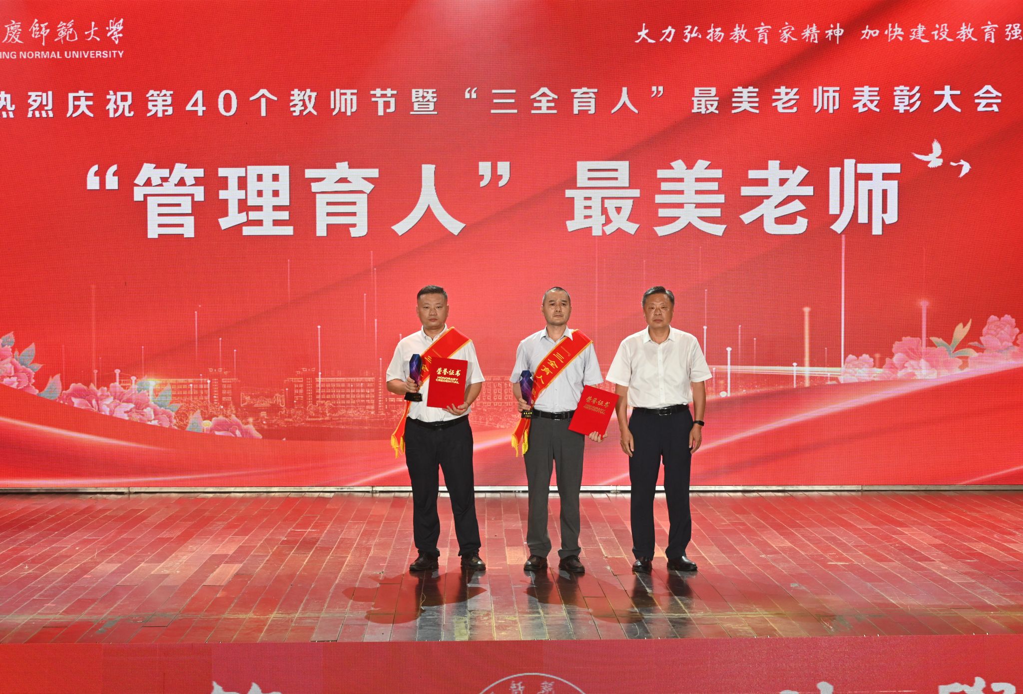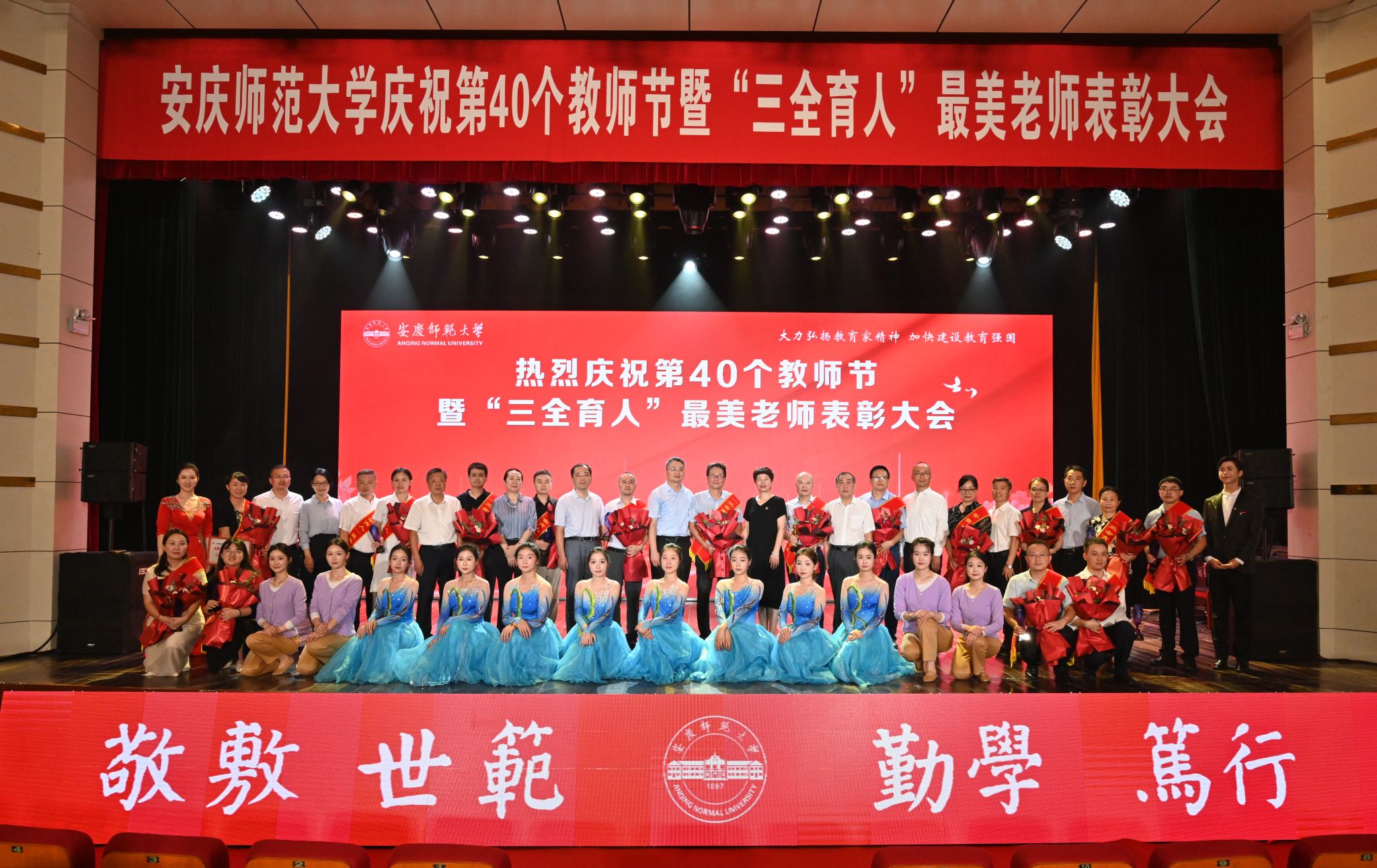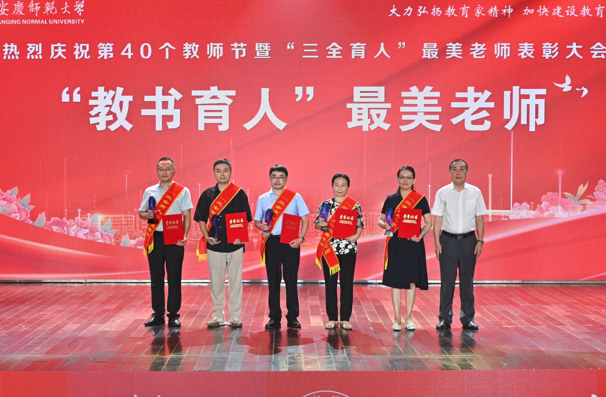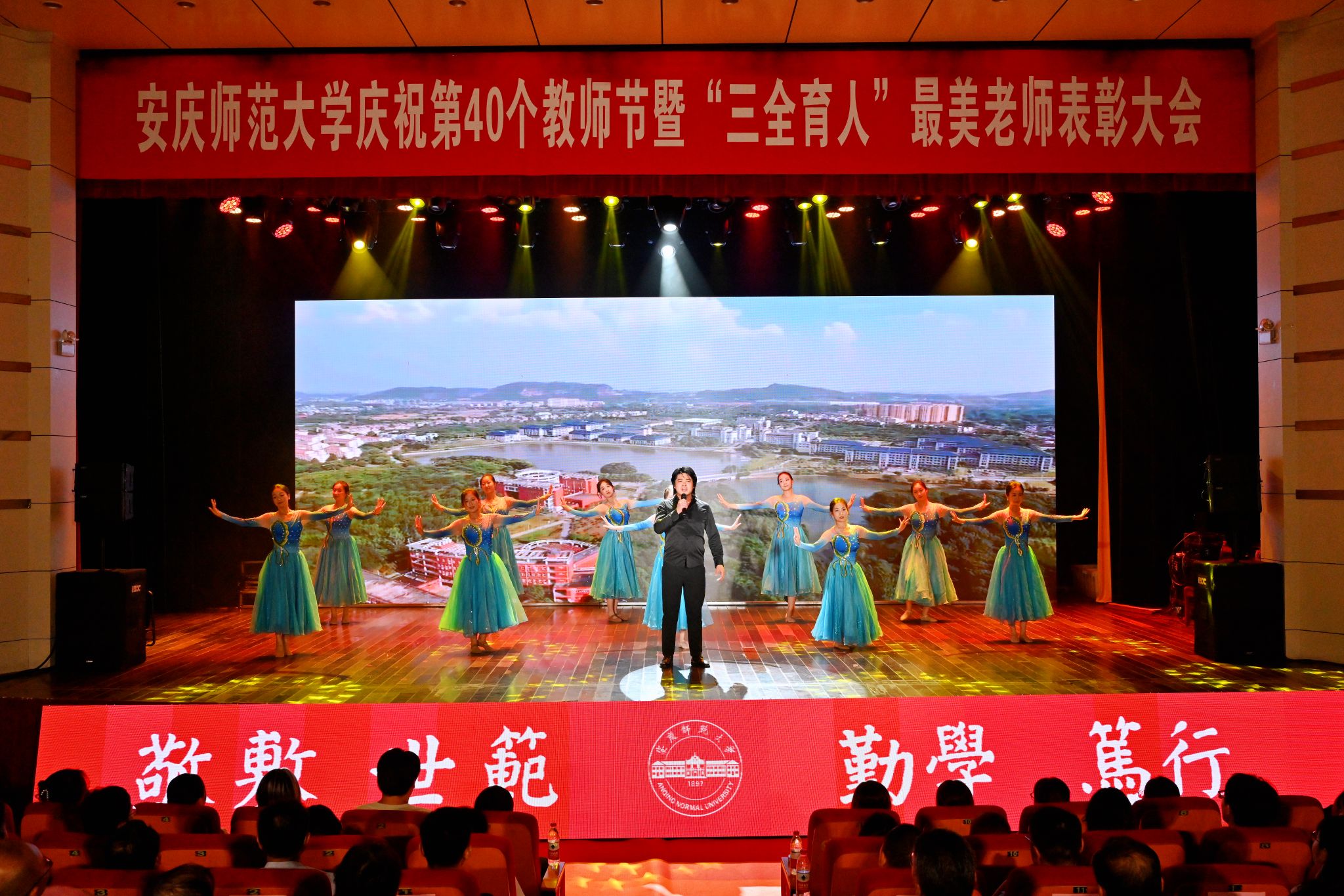 春华秋实硕果盈枝,韶华灼灼桃李芬芳。9月10日,学校在龙山校区音乐厅举行庆祝第40个教师节暨“三全育人”最美老师表彰大会。校党政领导李福华、彭凤莲、崔明、刘友忠、吴琼、肖新、秦朗、申传胜、陈秀、张红飞、计裕人出席大会。全体获奖教师和师生代表欢聚一堂,共同庆祝第40个教师节。