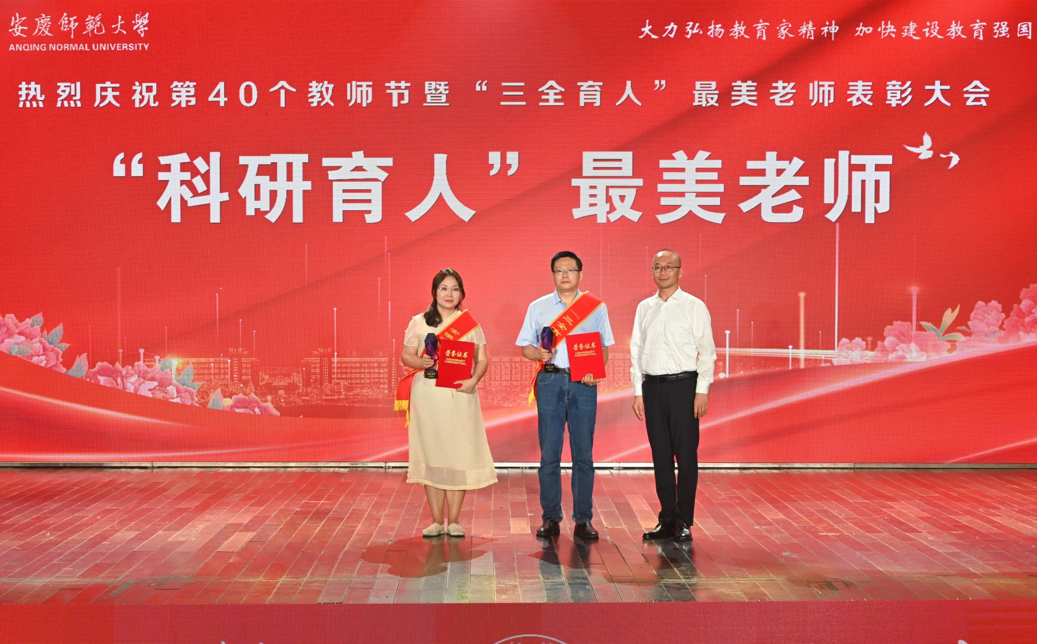三十年教书育人“秋实奖”获得者吴甘霖、董根明,“教书育人”最美老师叶仁玉、张文、张传磊、胡小兵、黄先军,“科研育人”最美老师毛晓霞、彭长生,“辅导员年度人物”李俊、张沐阳,“管理育人”最美老师邹斌、戴传红,“服务育人”最美员工丁青、何营等15位教师在会上受到表彰,校领导为获奖教职工颁发了奖杯和荣誉证书。