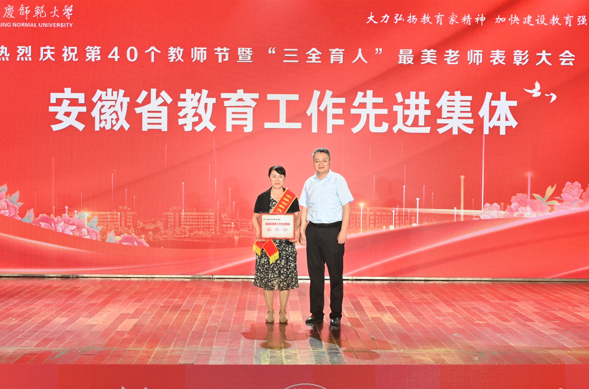 长期以来,beat365官网广大教师牢记初心使命,献身三尺讲台,培养了一批又一批的优秀人才,为加快全省教育事业发展和经济社会发展贡献了力量。马克思主义学院教师王翠萍获2024年安徽省优秀教师荣誉称号,计算机与信息学院获安徽省教育工作先进集体荣誉称号。李福华和校长彭凤莲为获奖教师颁奖,激励广大教师和教育工作者自信自强、踔厉奋发,为教育强国、教育强省作出更大贡献。