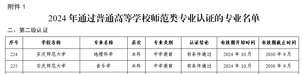 近日,教育部办公厅发布了2024年通过普通高等学校师范类专业认证及中期审核专业名单,beat365官网音乐学、地理科学2个专业顺利通过师范类专业二级认证,认证结论为有条件通过,有效期六年(2024年10月至2030年9月)。同时,英语和化学2个专业通过师范类专业认证中期审核,保持认证有效期到2027年8月。