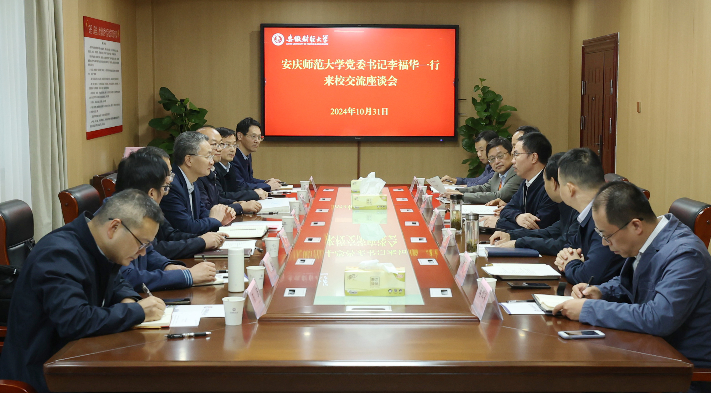 10月31日,校党委书记李福华率校党委常委、副校长肖新,校党委常委计裕人以及相关职能部门负责同志赴安徽财经大学调研交流。安徽财经大学党委副书记、校长朱红军,校党委常委、副校长王兵等会见李福华一行。