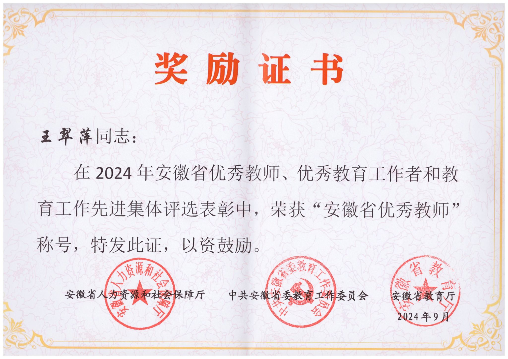 近日,安徽省人力资源和社会保障厅、中共安徽省委教育工委、安徽省教育厅印发《关于表彰2024年安徽省优秀教师、优秀教育工作者和教育工作先进集体的决定》,beat365官网计算机与信息学院荣获“安徽省教育工作先进集体”称号,马克思主义学院王翠萍教授荣获“安徽省优秀教师”称号。