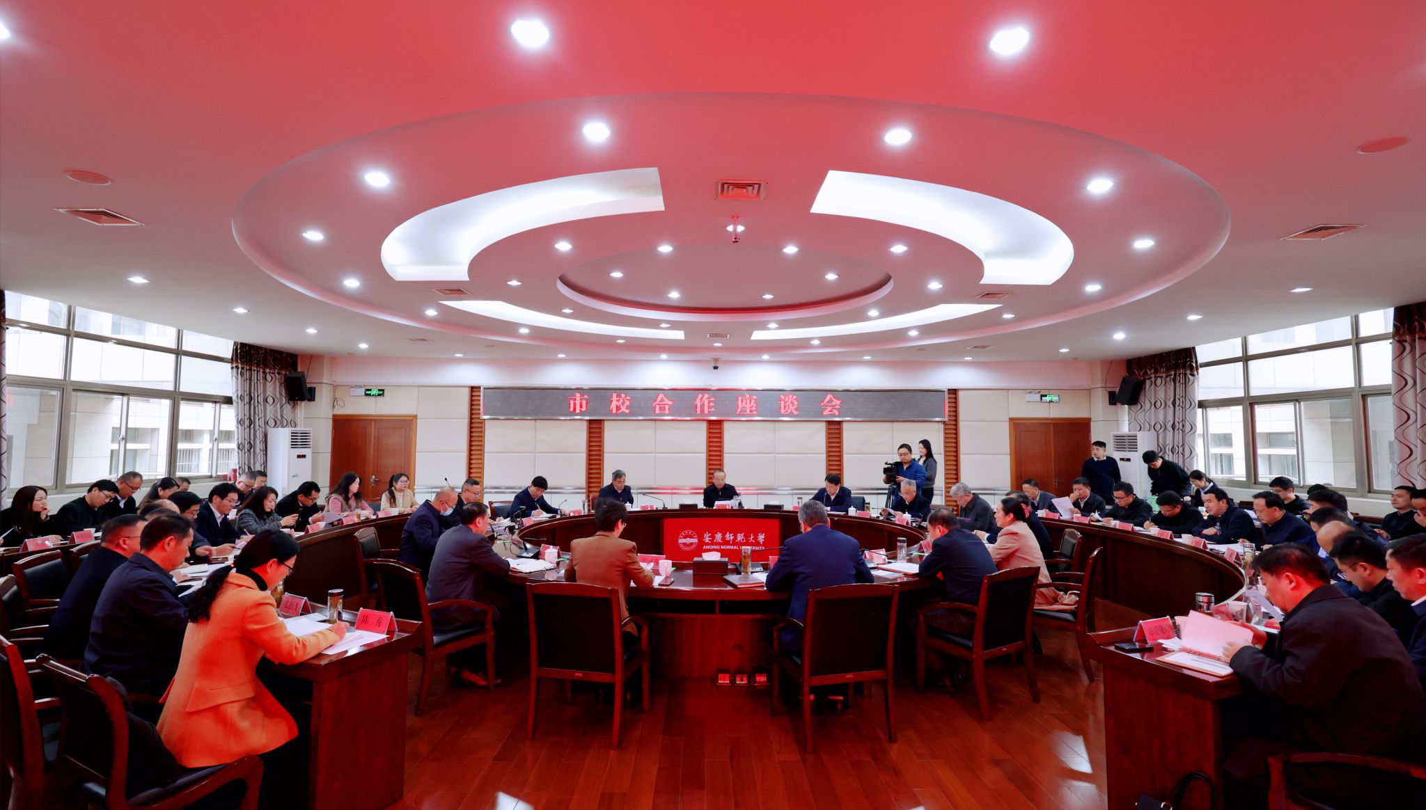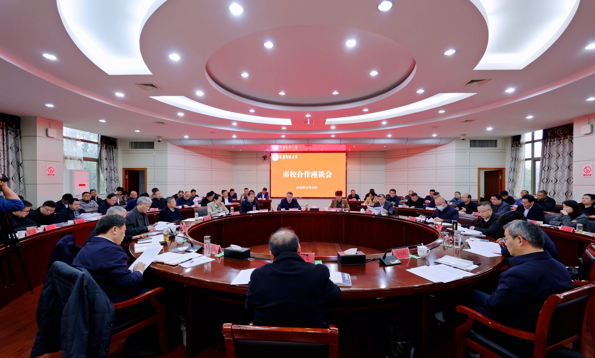 11月22日,安庆市委书记张祥安一行来校召开市校合作座谈会,会议由安庆市委副书记、市长张君毅主持。校领导李福华、彭凤莲、崔明、刘友忠、吴琼、肖新、秦朗、徐晓宁,安庆市领导花家红、徐雄、李文胜,校党委常委陈秀、张红飞、计裕人等出席会议。