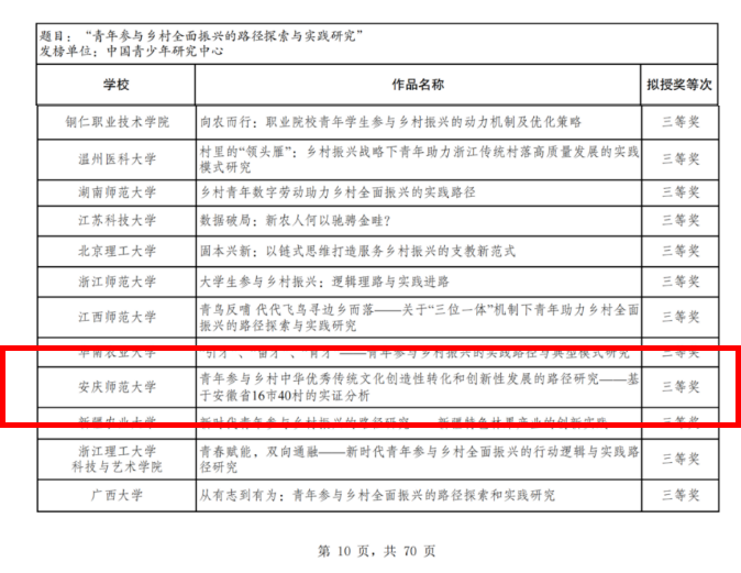 近日,由共青团中央、中国科协、教育部、中国社科院、全国学联联合主办的第十九届“挑战杯”全国大学生课外学术科技作品竞赛2024年度“揭榜挂帅”专项赛终审决赛落下帷幕,beat365官网《青年参与乡村中华优秀传统文化创造性转化和创新性发展的路径研究——基于安徽省16市40村的实证分析》《如何消除“脆皮大学生”——基于对大学生身心健康问题的探索研究》2项作品荣获全国三等奖。