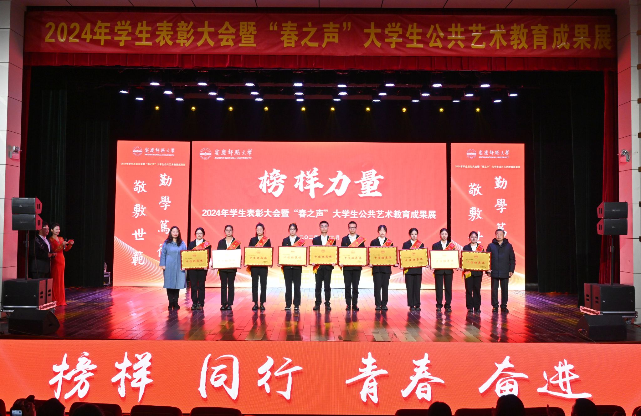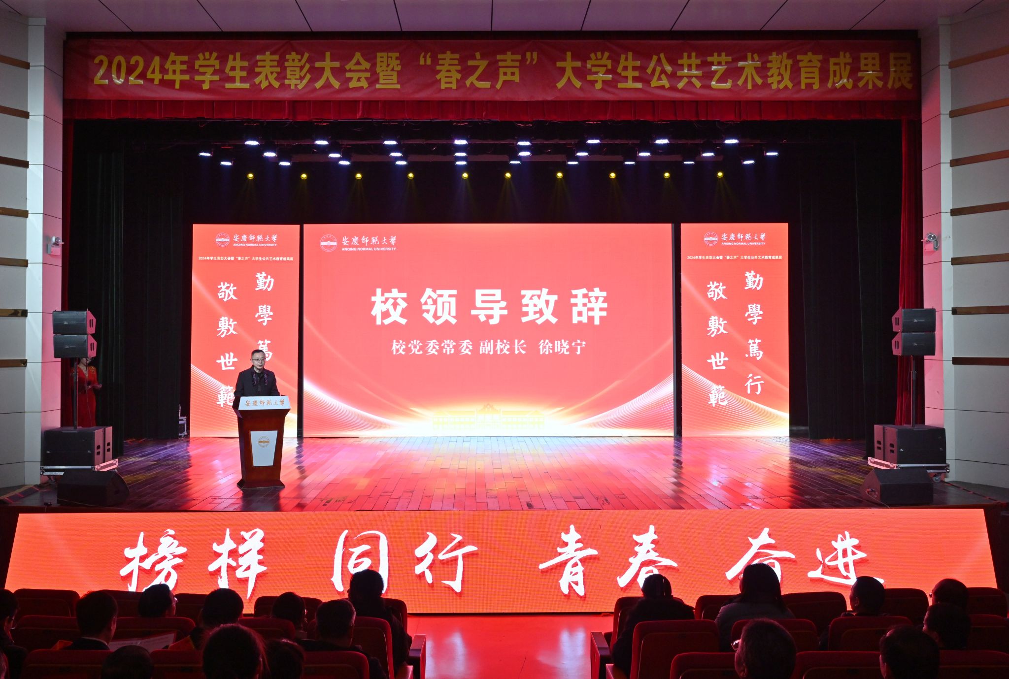 徐晓宁向受表彰的先进集体和个人表示祝贺,向潜心育人、辛勤培养学生成长成人成才成功的教职工表示感谢。他指出,2024年,全校各级学团组织、干部、教师深入贯彻党的二十届三中全会精神和习近平总书记考察安徽重要讲话精神,紧扣立德树人根本任务,牢固树立三全育人理念,深耕“3310”思想政治工作体系,深化“修德明理、修智敏学、修行律己”三修理念,推进“成长、成人、成才、成功”四成教育工程,在思想引领、学习实践、文体艺术、创新创业等方面取得了丰硕的成果。他勉励青年学生要坚定信念,在锤炼品德中凝聚奋进力量;要吃苦耐劳,在火热实践中练就过硬本领;要担当作为,在笃信笃行中磨砺成长。