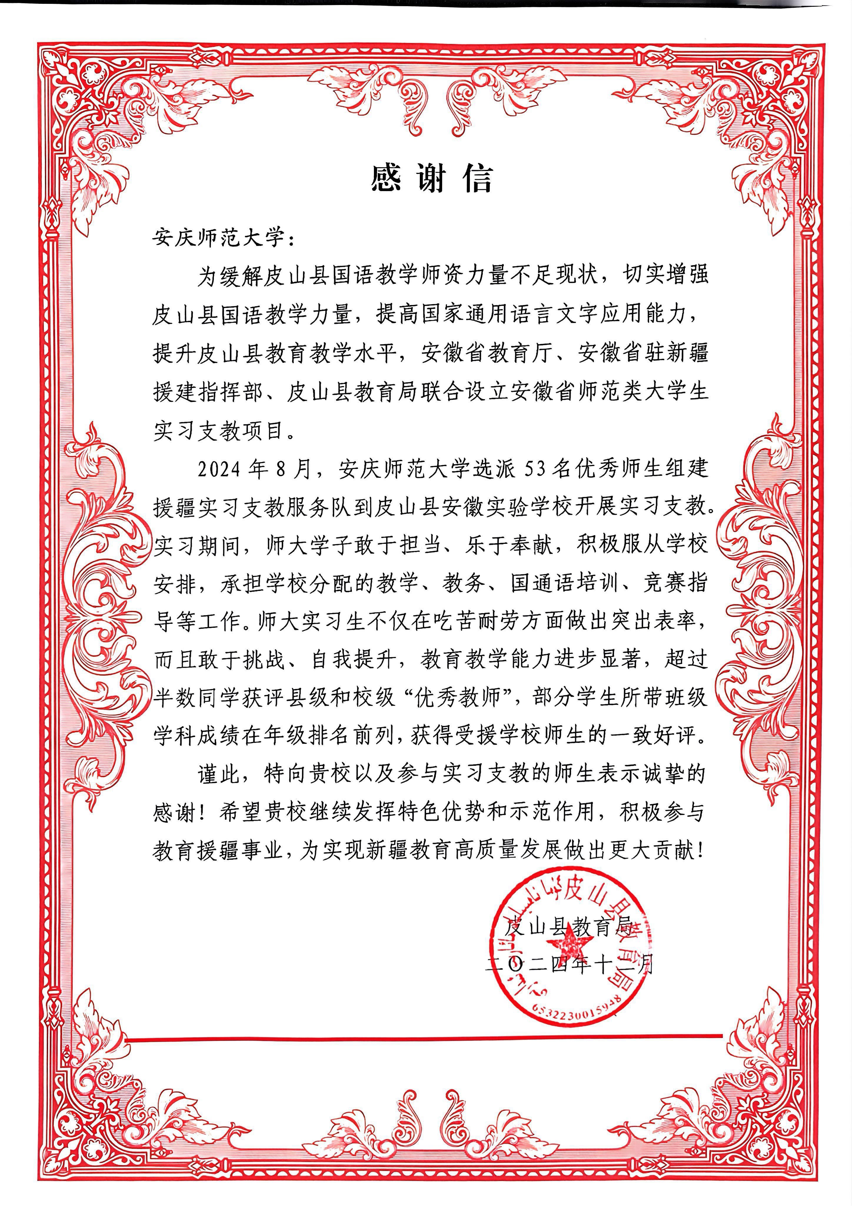 信中指出,为缓解皮山县国语教学师资力量不足的问题,提升当地教育教学水平,安徽省教育厅、安徽省驻新疆援建指挥部等部门联合设立安徽省师范类大学生实习支教项目。学校积极响应号召,2024年下半年选派53名优秀师生组建第一批援疆支教志愿服务队前往皮山县安徽实验学校,他们的突出表现赢得受援学校师生一致好评。
