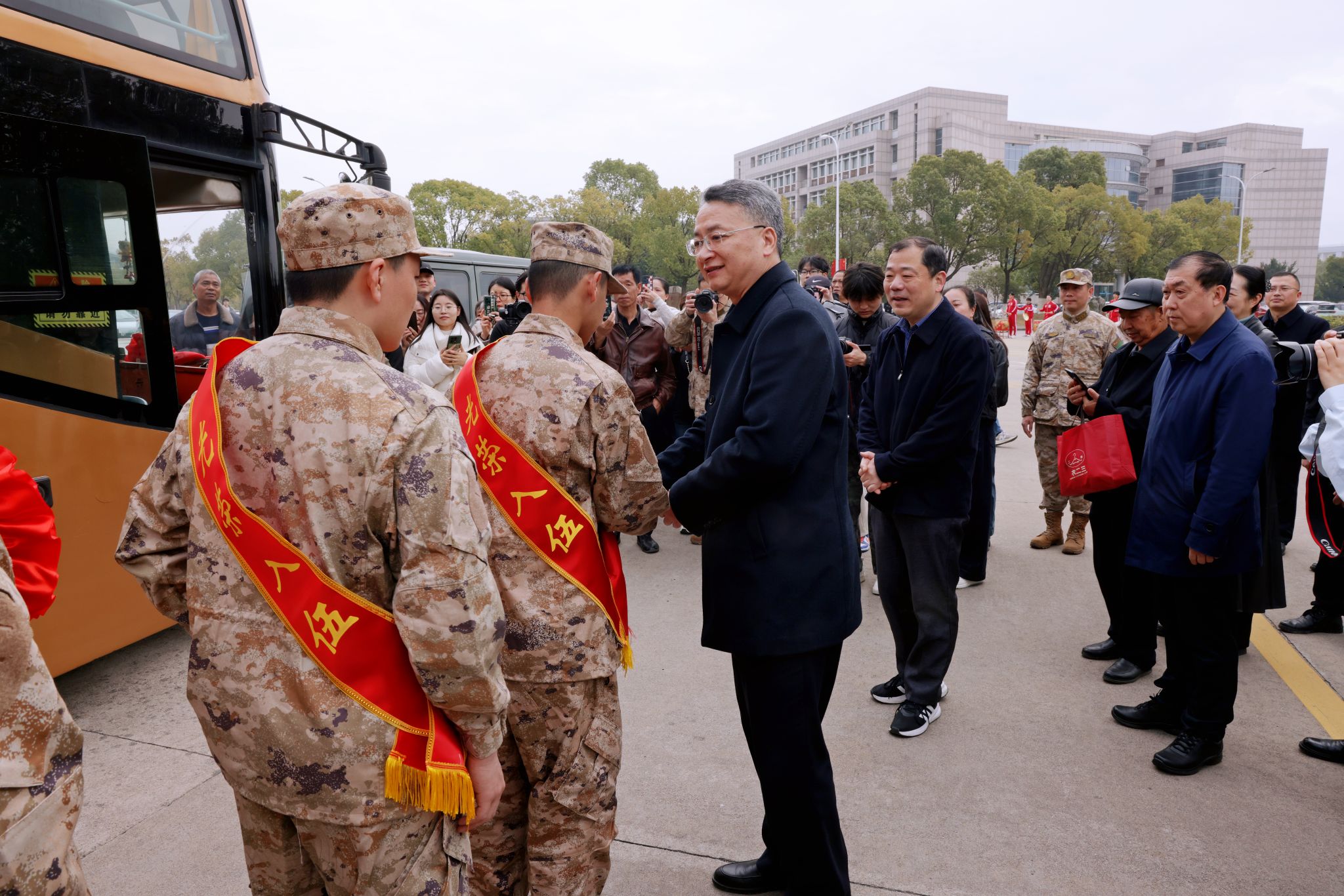 欢送仪式上,与会全体校党政领导为2025年春季入伍大学生佩戴光荣花。