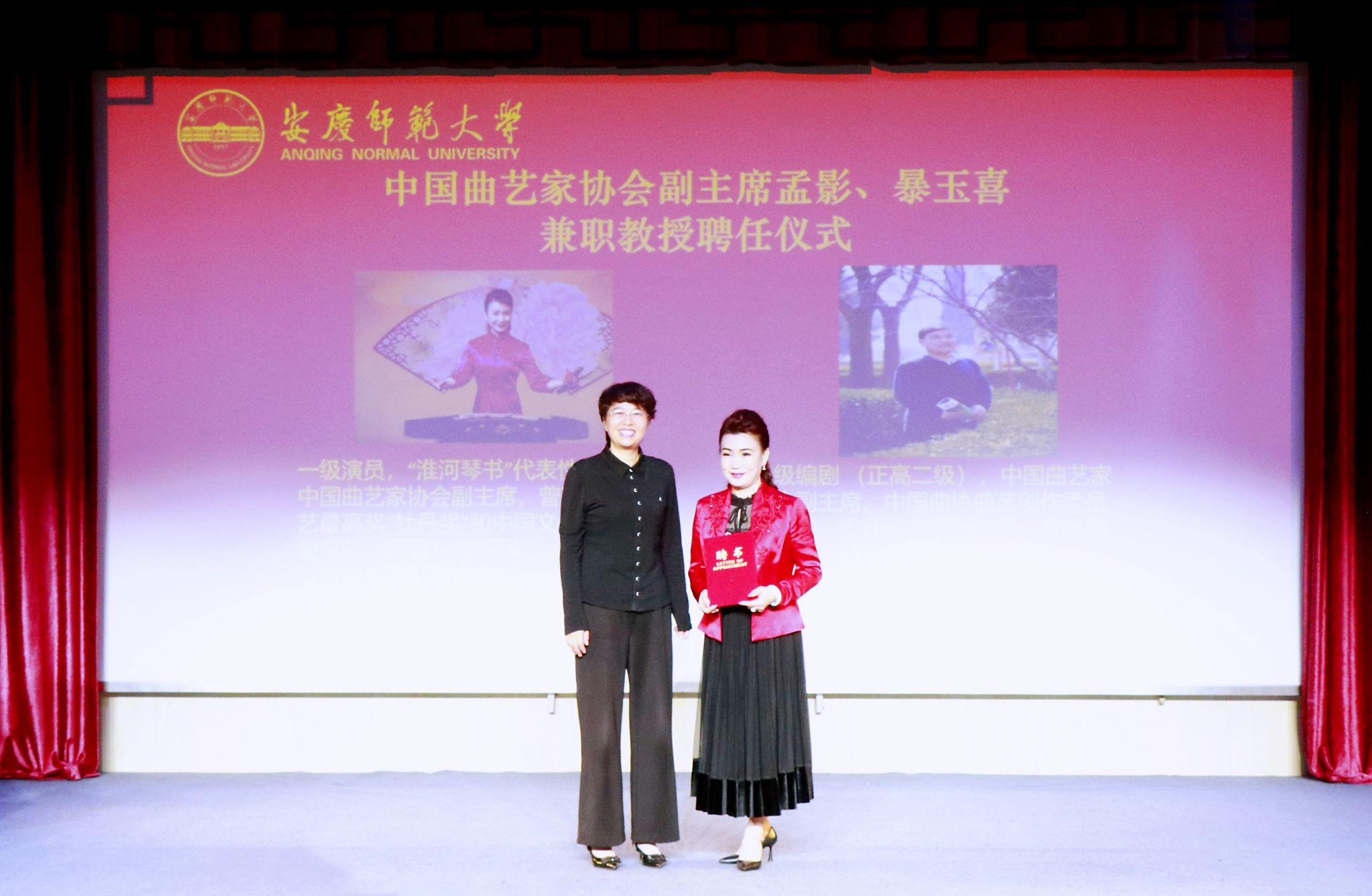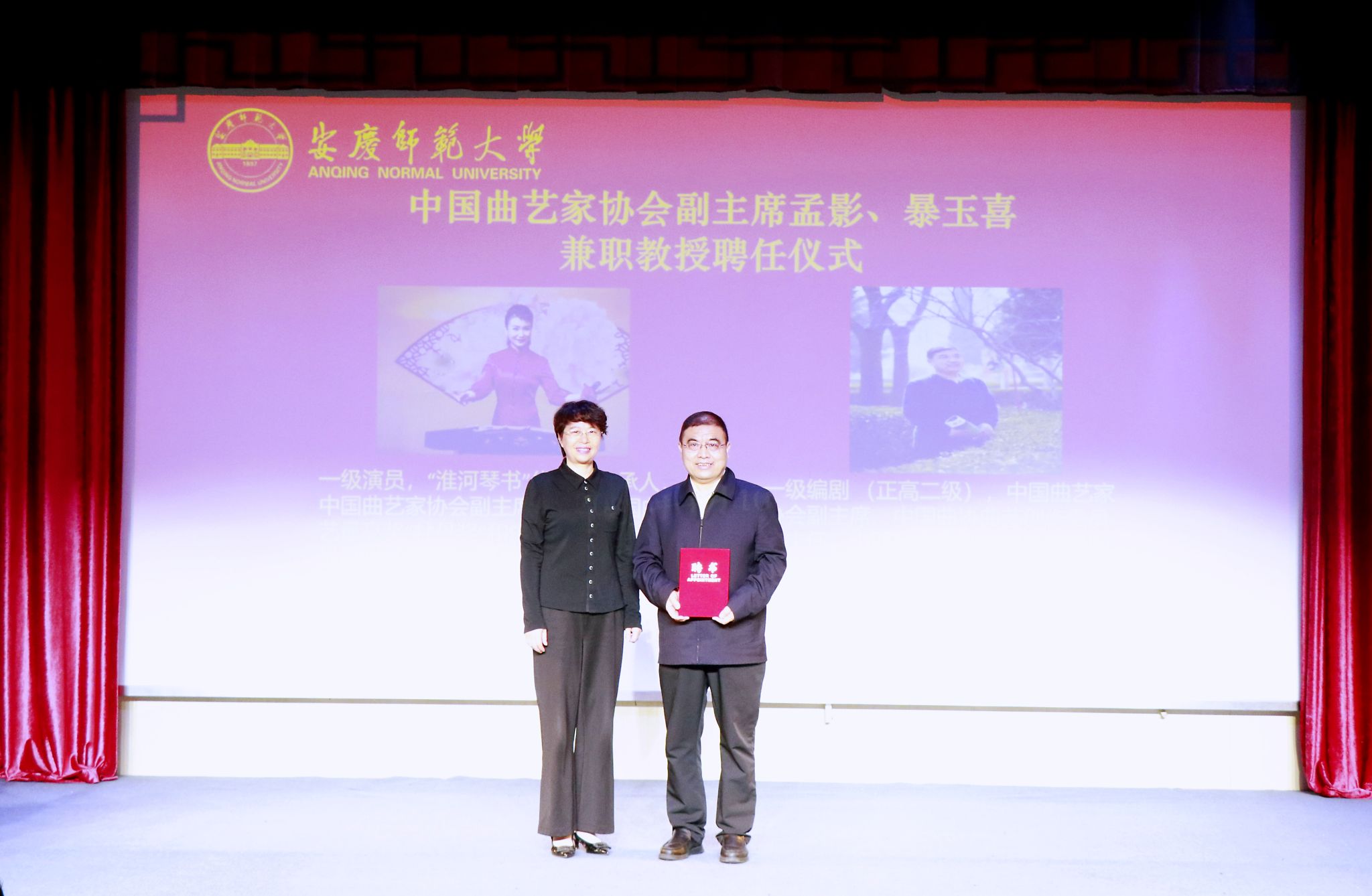彭凤莲分别为孟影、暴玉喜颁发兼职教授聘书,对他们加盟beat365官网表示热烈欢迎。彭风莲介绍了学校的发展历程、基本情况和办学特色。她表示,中国曲艺家协会两位副主席的加盟,必将对学校曲艺学科建设产生重大而深远的影响。希望黄梅剧艺术学院进一步强化曲艺学科建设,全力推进戏曲与曲艺博士点立项建设,培育打造标志性成果,为中华优秀传统文化创造性转化和创新性发展作出新的贡献。