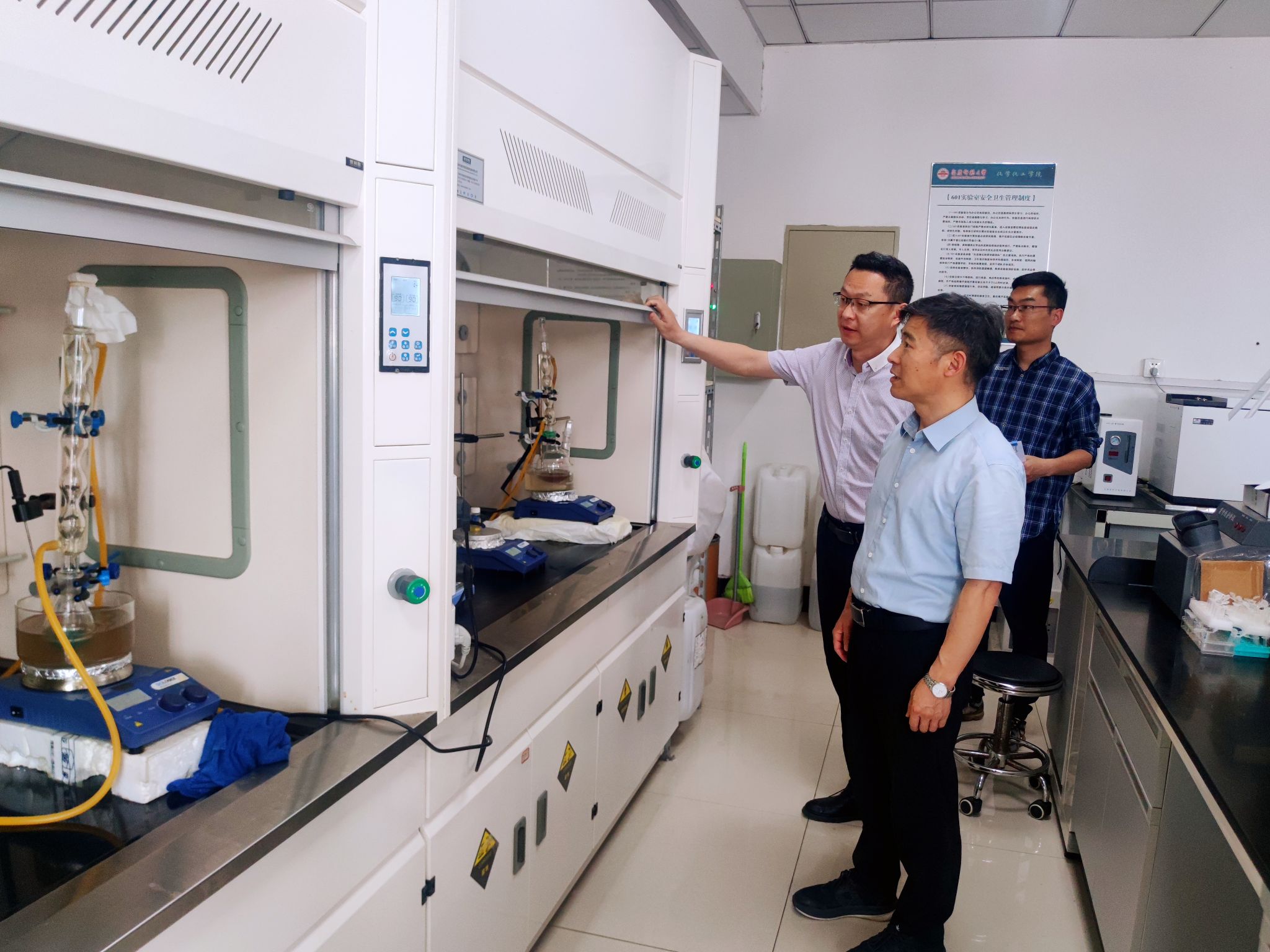 申传胜一行深入化学化工学院、电子工程与智能制造学院和计算机与信息学院等学院实验室,检查实验室危化品管理制度与操作规程的遵守、危化品管理与使用以及实验室用水用电等情况,与相关学院负责人进行了深入交流。申传胜指出,实验室安全是各项工作的重中之重,实验室安全隐患排查要做到常态化,发现隐患,及时整改,筑牢实验室安全防线,为师生营造安全、有序的实验环境。
