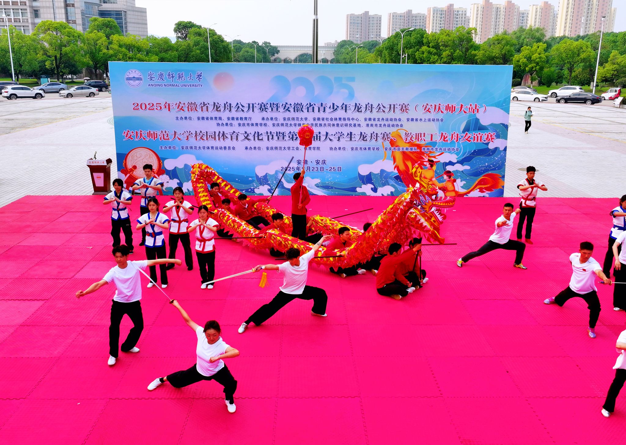 5月24日,2025年安徽省龙舟公开赛暨安徽省青少年龙舟公开赛(安庆师大站)在beat365官网龙山校区双龙湖举办。来自各地的健儿们以舟为笔、以桨为墨,挥写出属于龙舟竞技的澎湃韵律。