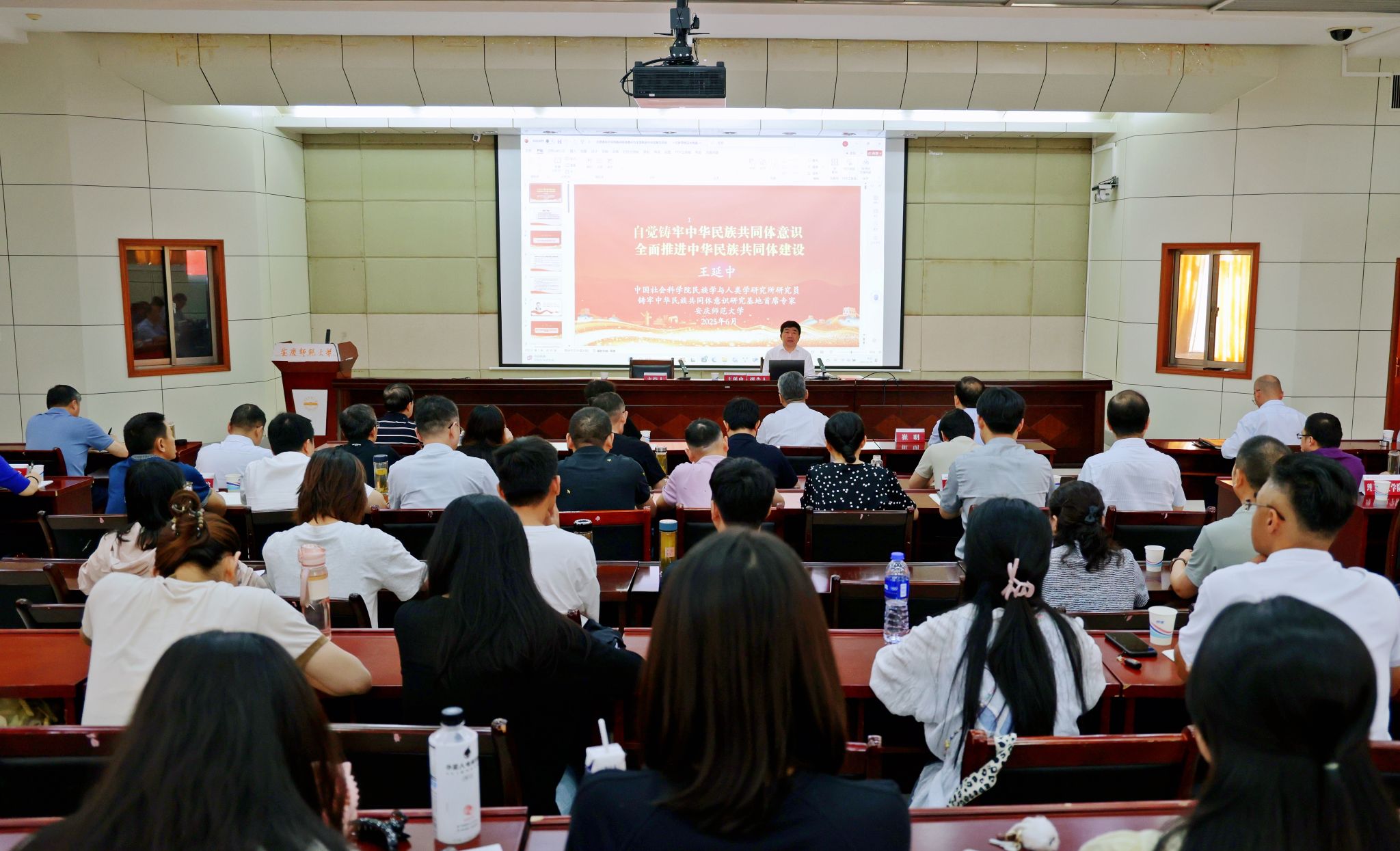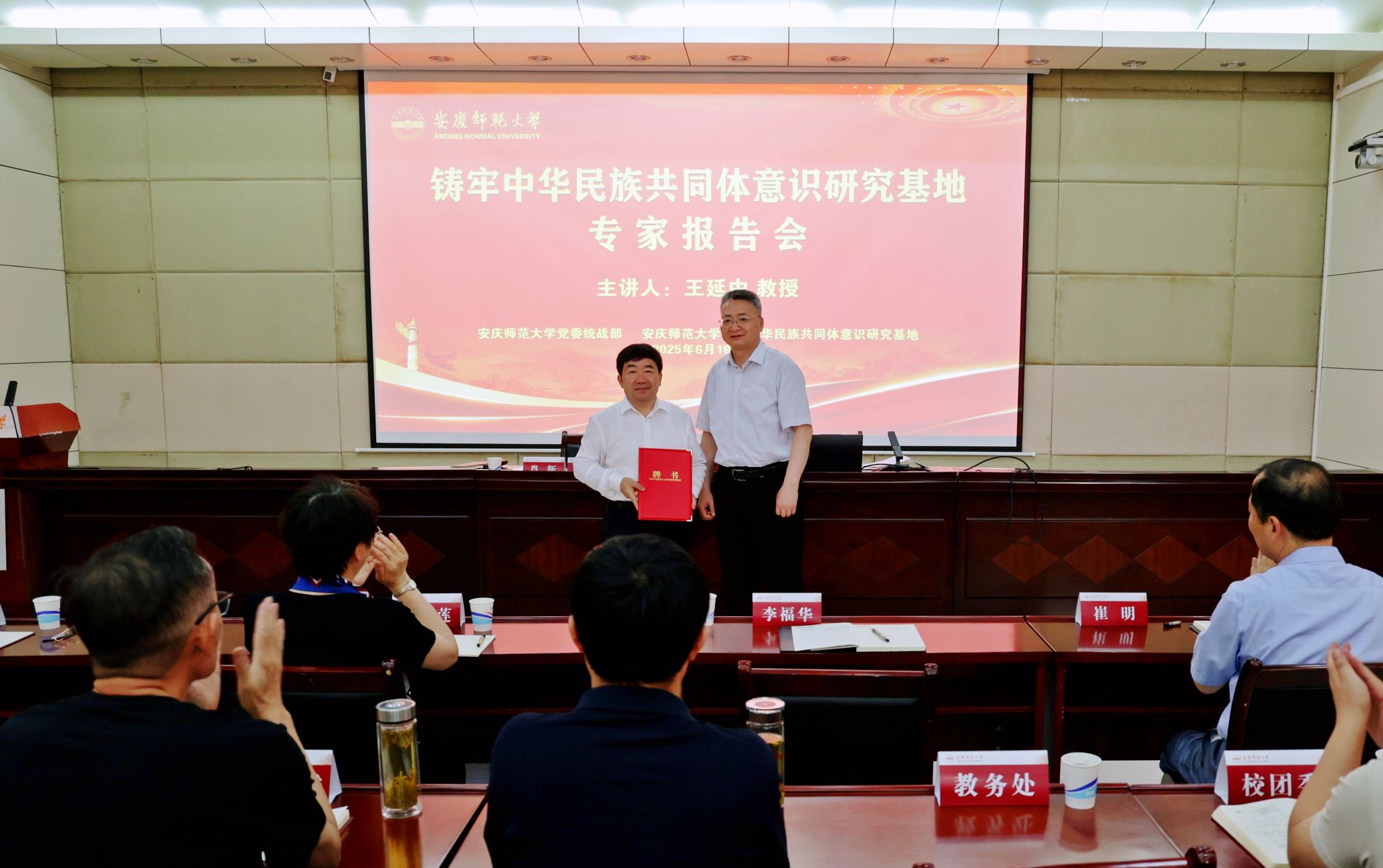 6月18日,学校铸牢中华民族共同体意识研究基地邀请中国社会科学院研究员王延中教授作“自觉铸牢中华民族共同体意识,全面推进中华民族共同体建设”专题报告。报告会前,校党委书记李福华向王延中颁发了研究基地名誉顾问聘书。校党委常委、副校长肖新主持报告会。校党政班子成员,各院级党组织主要负责人和相关职能部门负责人,学校铸牢中华民族共同体意识研究基地全体研究员和部分师生参加报告会。