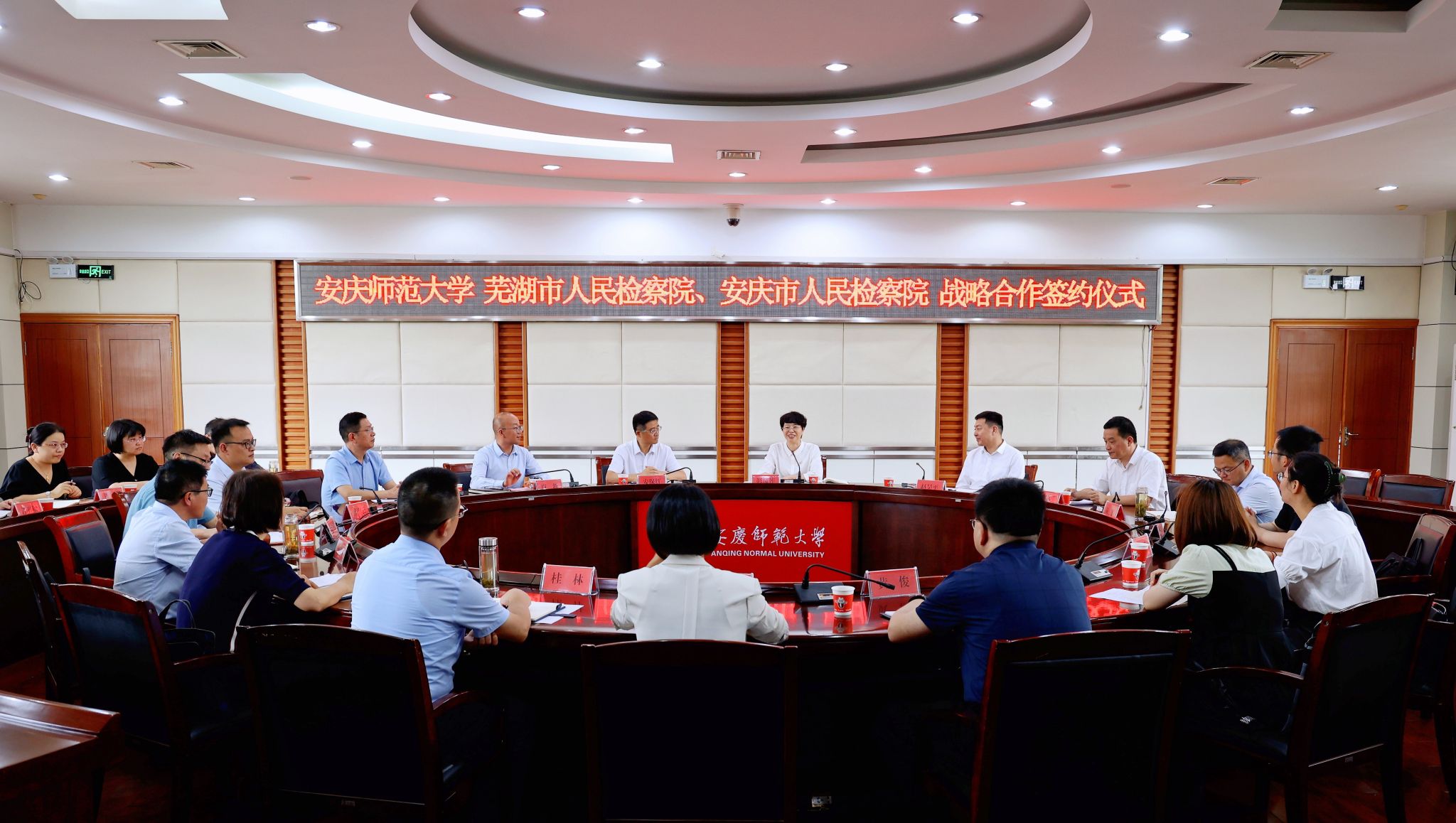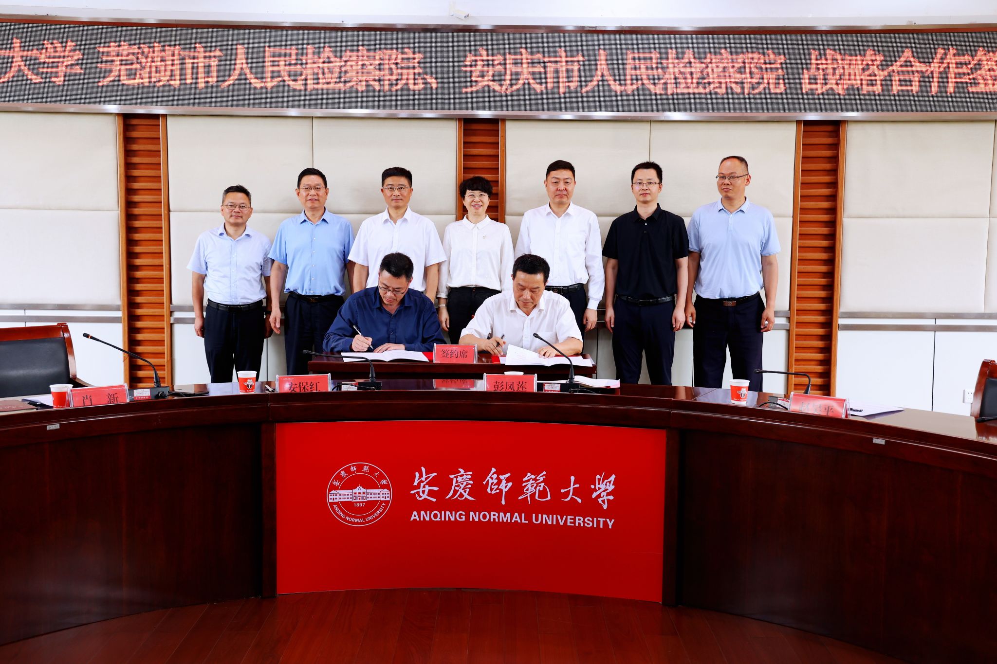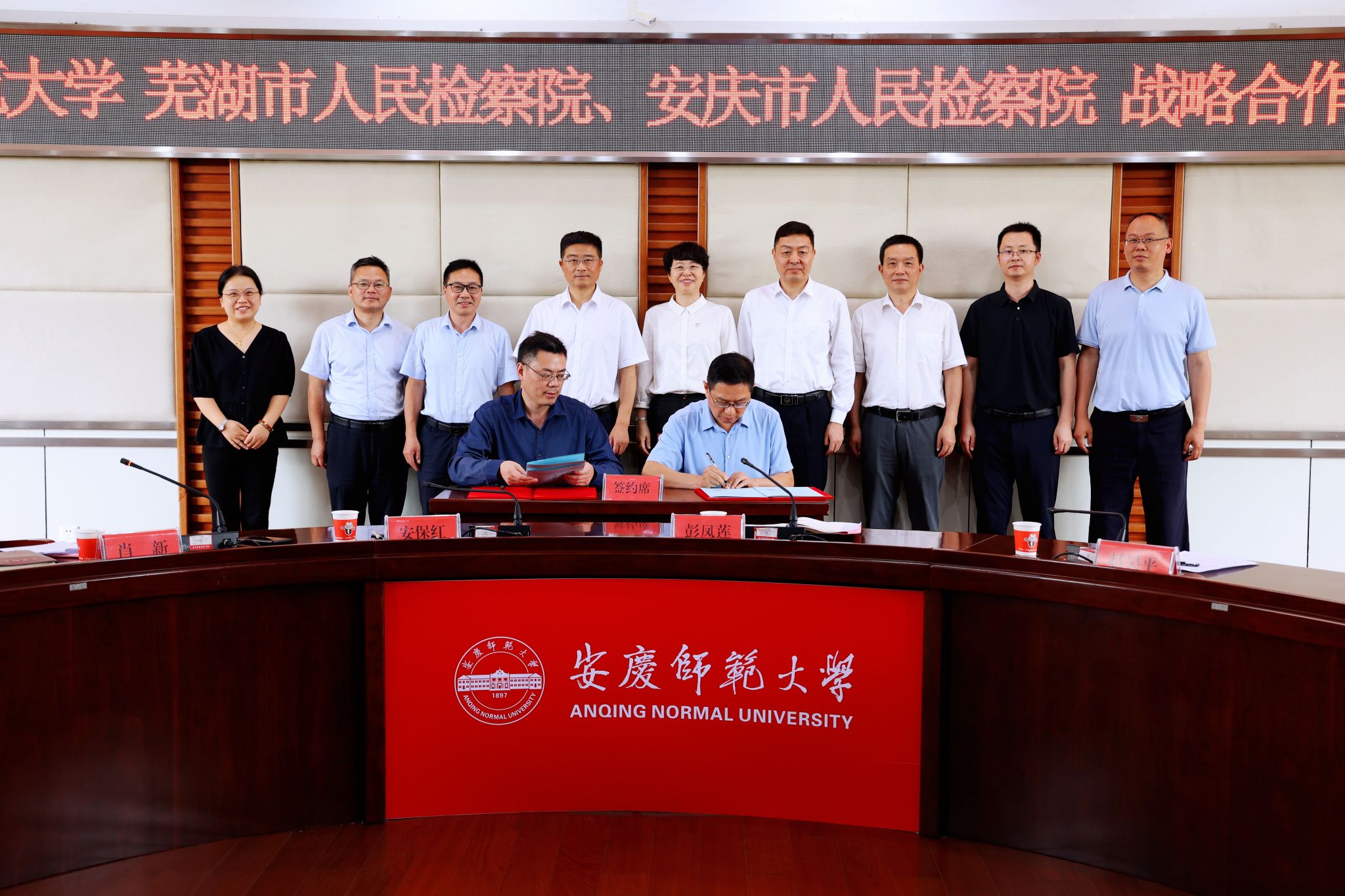 6月19日,学校与芜湖市人民检察院、安庆市人民检察院举行战略合作签约仪式。校长彭凤莲,芜湖市人民检察院党组书记、检察长赵昊平,安庆市人民检察院党组书记、检察长安保红,芜湖市人民检察院党组副书记、副检察长丁必勇,安庆市人民检察院党组副书记、副检察长李振宏,芜湖市人民检察院党组成员、政治部主任王明,安庆市人民检察院党组成员、政治部主任陈团结出席。仪式由校党委常委、副校长肖新主持。