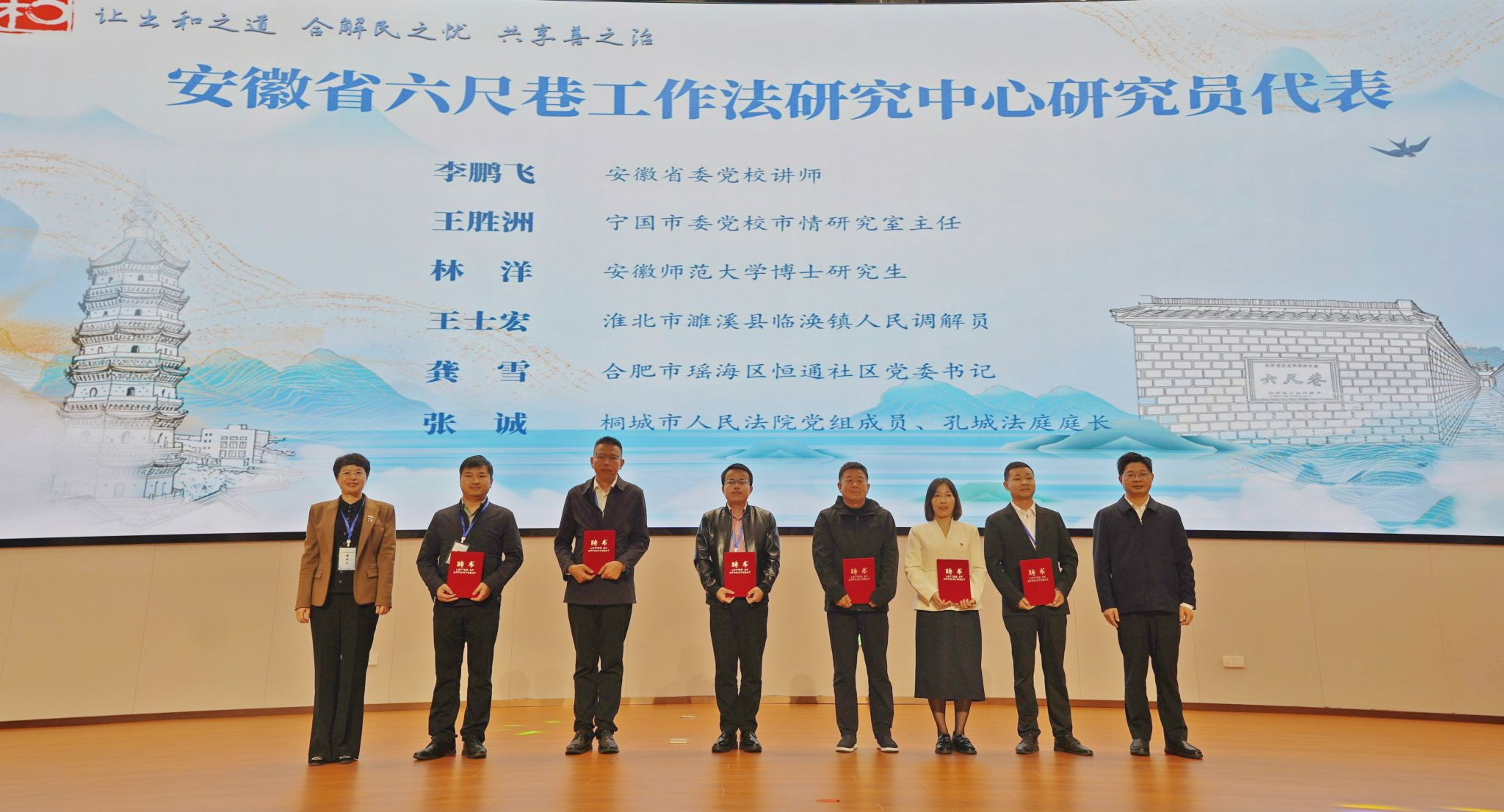 开幕式上,与会领导为六尺巷社区治理学院客座教授代表颁发聘书,为安徽省六尺巷工作法研究中心研究员代表颁发聘书,并为六尺巷工作法核心内涵表述语获奖者和征文活动优秀论文代表颁奖。
