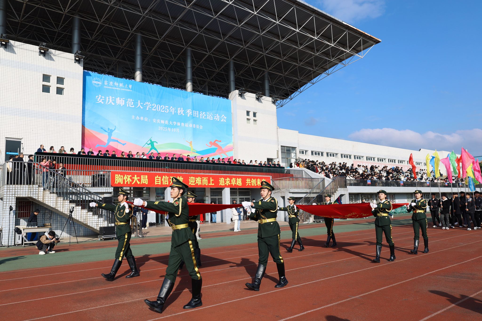 在庄严的国歌声中,国旗护卫队步伐铿锵地护送国旗经过主席台,接受全校师生的检阅。校旗队、彩旗队、各学院运动员方阵、教工代表队方阵、裁判员方阵依次入场。