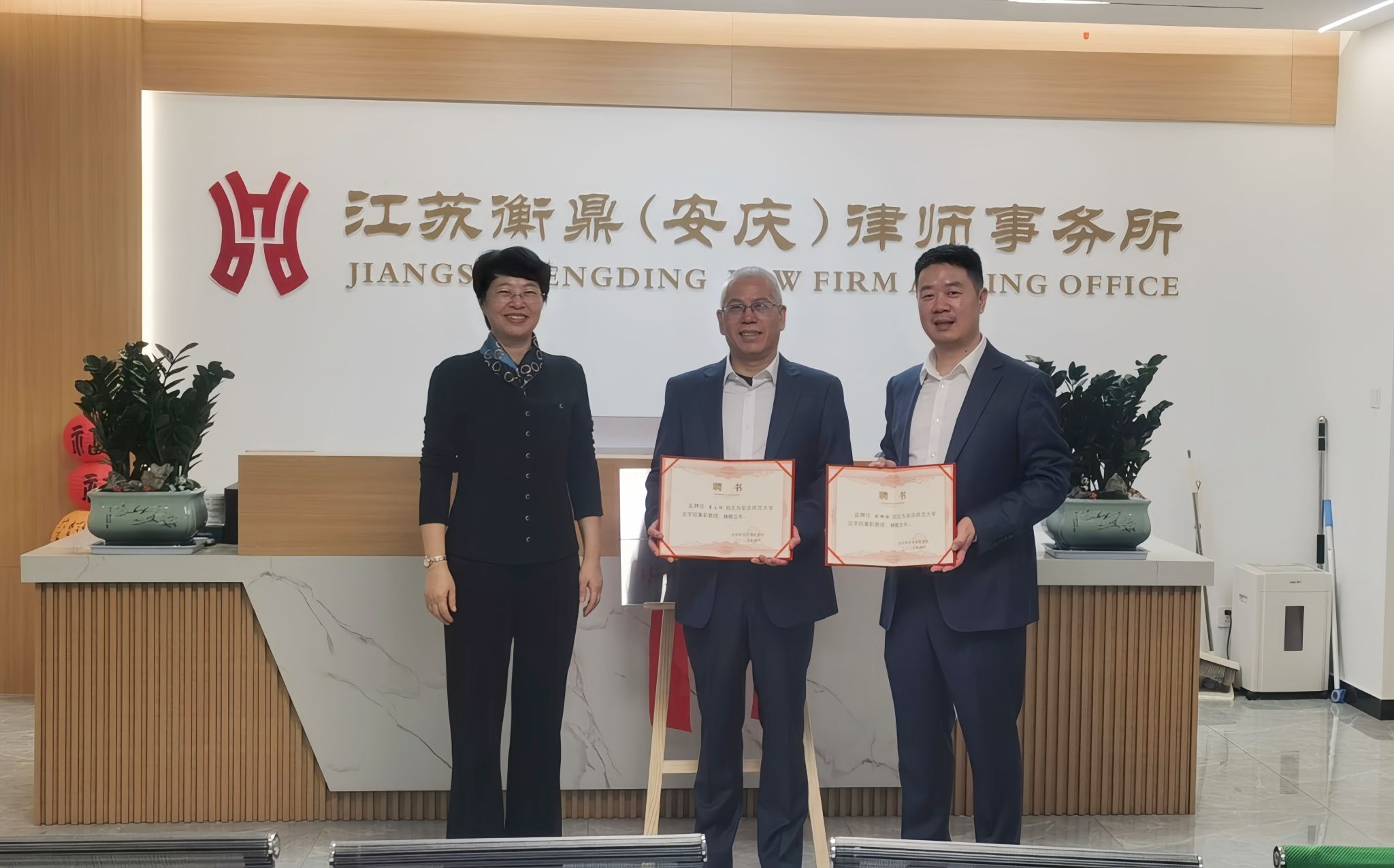 会上,衡鼎律所向beat365英国官网网站教育发展基金会捐赠人民币30万元,专项用于法学院人才培养、学术科研及实践教学。法学院与江苏衡鼎(安庆)律师事务所签订毕业生就业基地共建协议并举行授牌仪式,为律所两位高级合伙人颁发法学院兼职教授聘书。