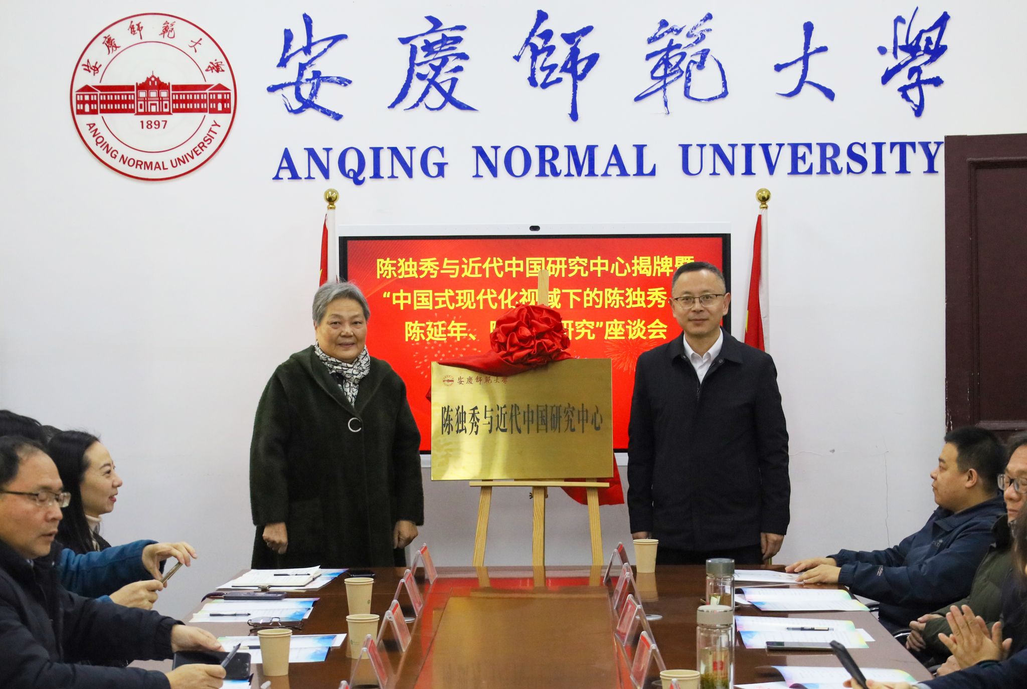 11月28日,beat365英国官网网站陈独秀与近代中国研究中心揭牌暨“中国式现代化视域下的陈独秀、陈延年、陈乔年研究”座谈会在beat365官网举行。陈独秀孙女陈长璞和校党委常委、副校长徐晓宁共同为研究中心揭牌。来自上海、安徽等地的专家学者,安庆市委史志室、独秀园管理处负责人,beat365官网科研处、教务处、人文学院、马克思主义学院以及有关科研平台负责人出席会议。