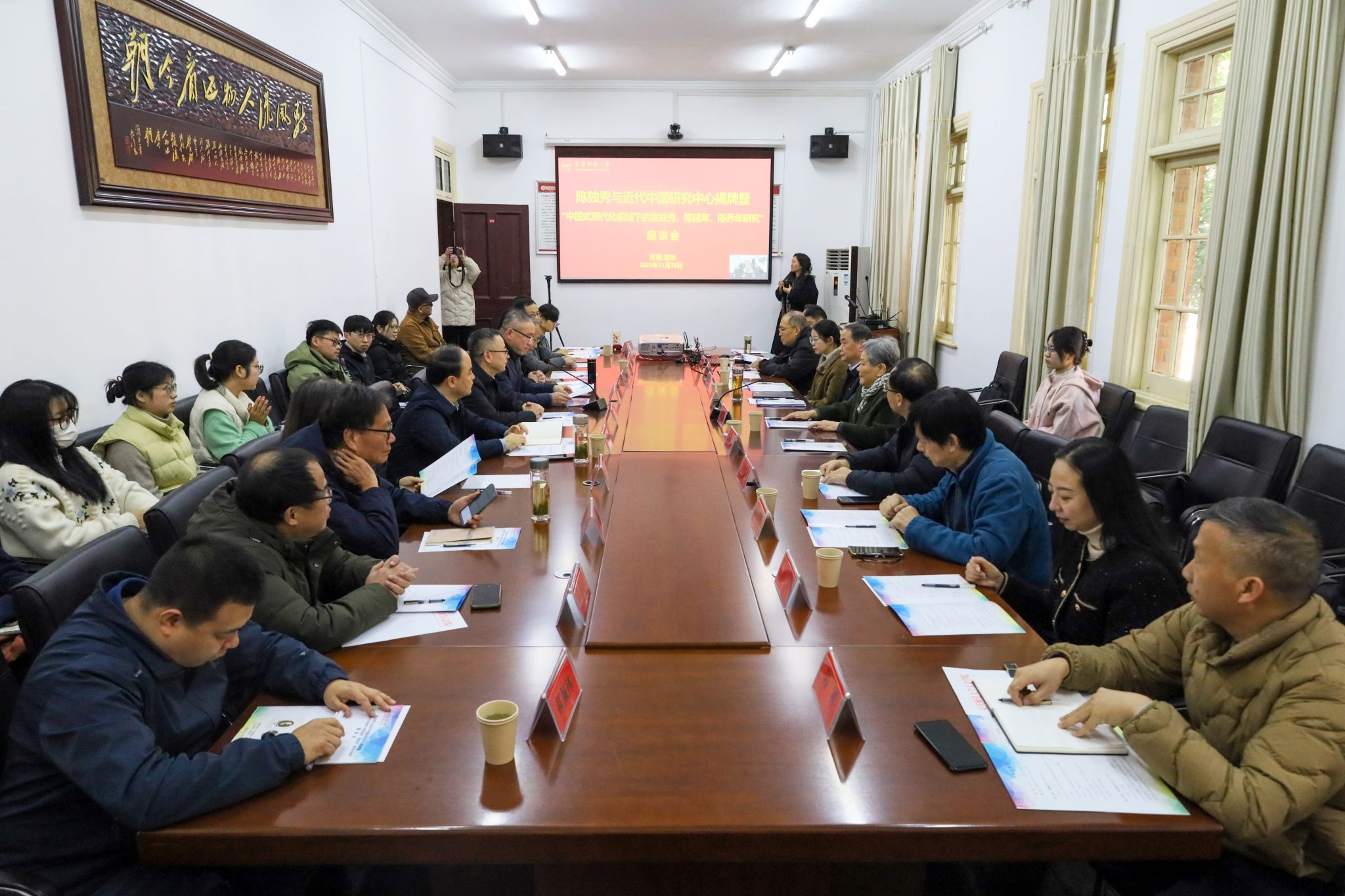 长期以来,学校致力于陈独秀研究的理论探索。1992年在学报开设“陈独秀研究”专栏,累计发表成果180多篇。2000年学校成立陈独秀研究所,成员先后承担省级以上课题30余项,在《新华文摘》《党的文献》《安徽史学》等期刊发表论文100余篇,出版《陈独秀与中国现代化》等专著10余部。近年来,学校围绕“三陈”研究开展了多学科多维度的实践创新,相继开设了《陈独秀研究》相关课程,打造了“延乔”卓越拔尖人才班、“延乔书屋”,编演了原创话剧《延乔兄弟》,校团联合打造大型黄梅戏《延年和乔年》,在社会上产生了广泛影响。下一步,中心将推进建章立制和学术队伍建设,加大研究资料搜集整理及数字化,加强协同创新,组织开展一系列学术、咨政及育人活动,不断扩大平台成果产出率和社会影响力。(撰稿:司佳宁 刘佩 摄影:张宇欣 陶若熙 编辑:范龙超 审核:汪孔丰 赵丽丽)