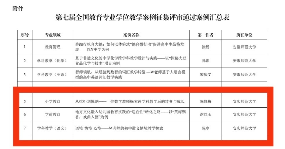 教育科学学院教师陈修梅撰写的教学案例《从抗拒到悦纳——一位数学教师探索跨学科教学后的转变与成长》、教育科学学院教师谢红玉撰写的《地方文化融入幼儿园教育实践的“适宜性”转化之路——以“黄梅飘香,戏曲入园”为例》、人文学院教师陈卓撰写的《语境·情境·心境——M老师的初中散文情境教学探索》入选中国专业学位教学案例中心案例库,截至目前,beat365官网已有9篇研究生教学案例入选案例库。