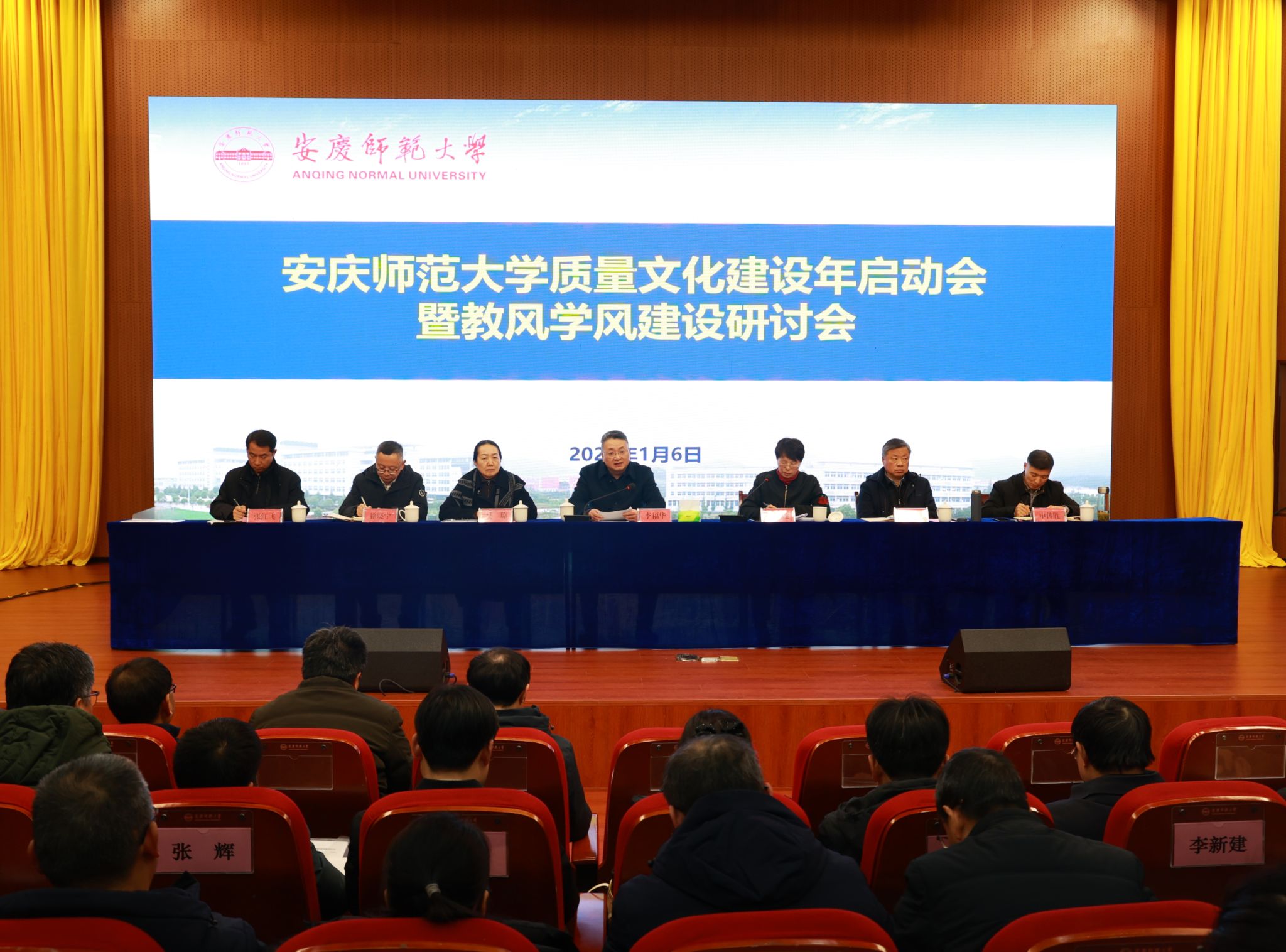 1月6日,学校召开质量文化建设年启动会暨教风学风建设研讨会,会议以“追求卓越文化,狠抓教风学风”为主题。会议特邀安徽大学原党委书记蔡敬民教授、同济大学李亚东研究员作专题辅导报告。校党委书记李福华,校长彭凤莲,校党委常委、副校长吴琼,校党委常委、纪委书记秦朗,校党委常委、副校长徐晓宁、申传胜,校党委常委、办公室主任张红飞出席会议。各学院及职能部门主要负责人、校级教学督导员、师生代表等近300人参加会议。