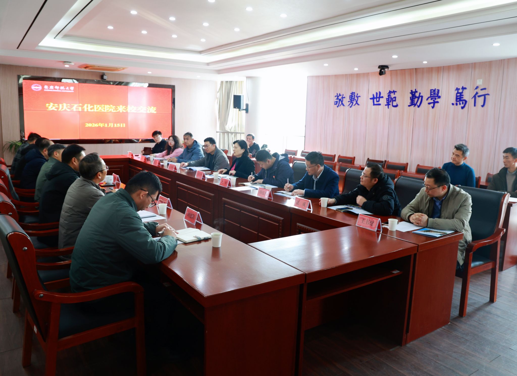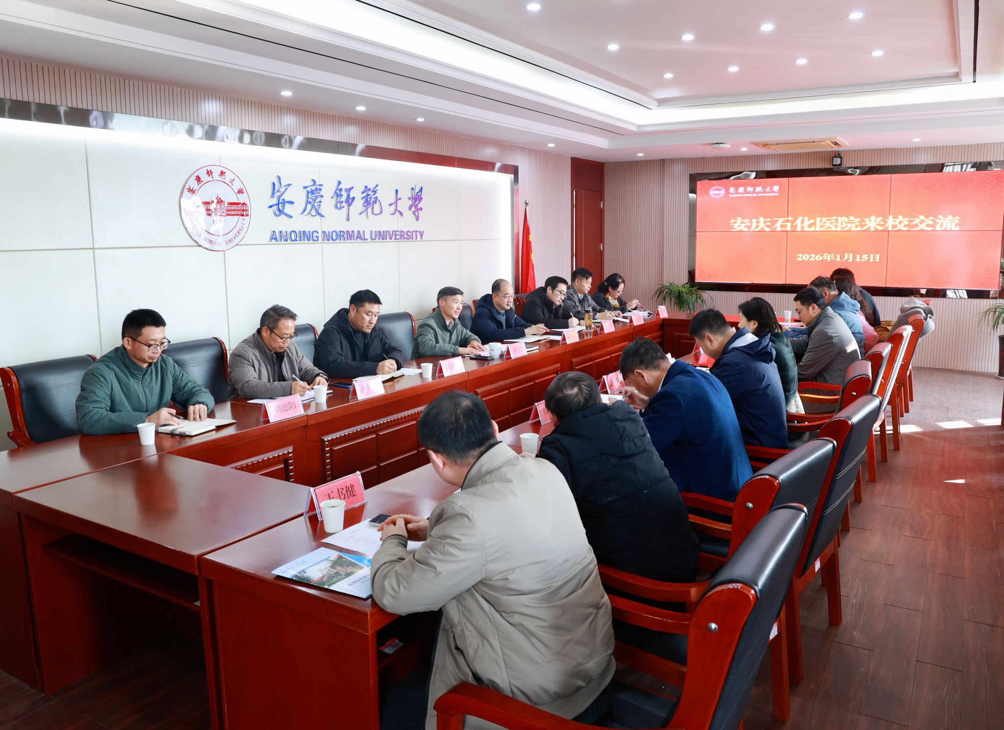 1月15日,南京鼓楼医院集团安庆石化医院院长韦宁华、副院长史炯一行来校洽谈合作。校党委常委、副校长申传胜出席会议。校服务经济社会发展处、体育学院、数理学院、计算机与信息学院、生命科学学院负责人和安庆石化医院相关科室负责人参会。