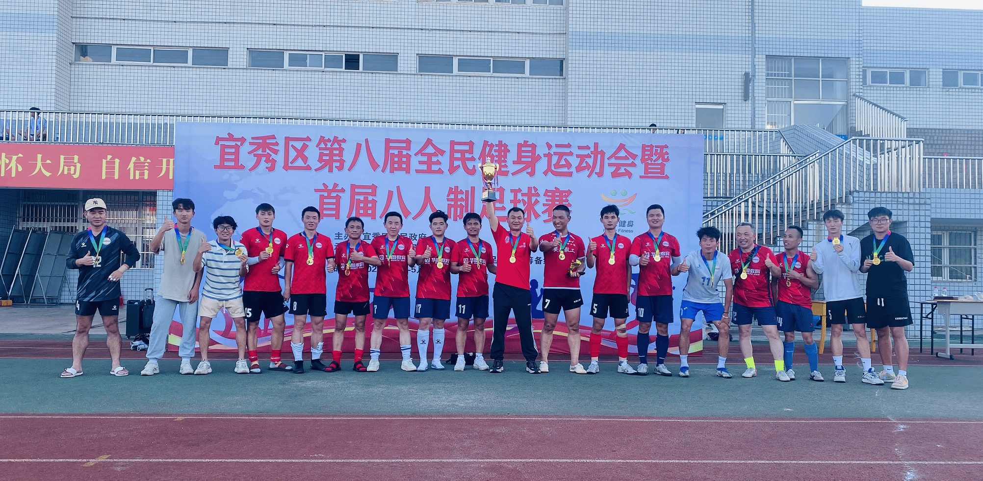 5月28日,历时一个月的宜秀区第八届全民健身运动会暨首届八人制足球赛,经历五轮激战,在beat365官网风雨足球场落下帷幕,beat365官网教职工足球队荣获冠军。