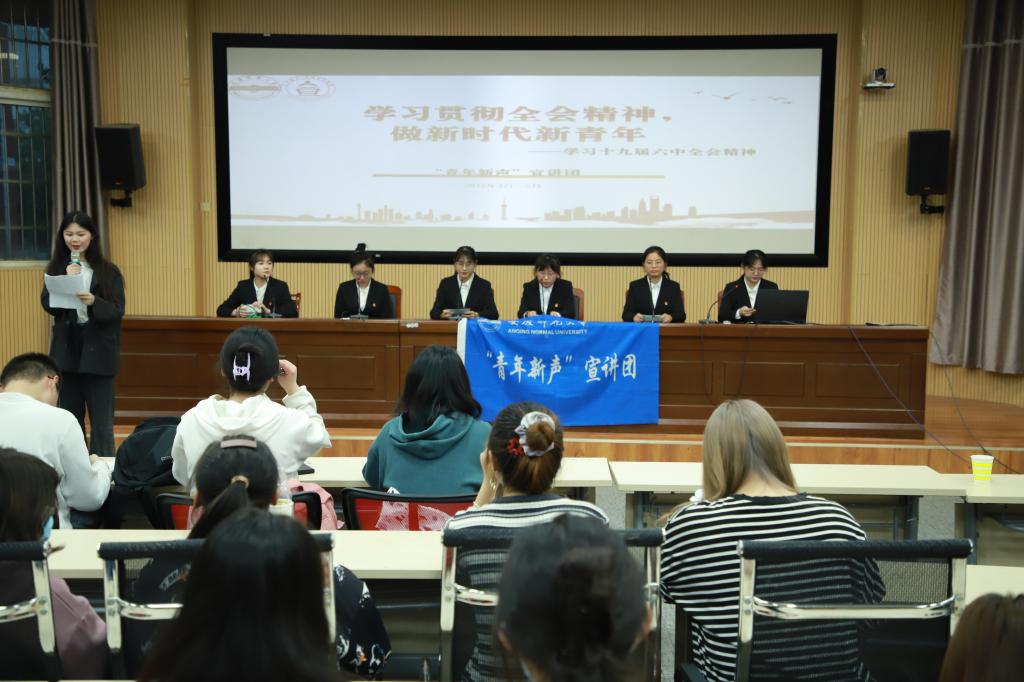 “有人知道十九届六中全会召开的时间吗?”思想政治教育专业2021(1)班的李宗韫以一个简单的问题展开宣讲,她将本次宣讲内容归纳为“一个主题”“两个确立”、“三大历史性飞跃”“四个伟大成就”“党的百年奋斗的五个历史性意义”和“百年巨变”六个部分,并结合幻灯片,图文并茂地向同学们介绍了第一部分内容。