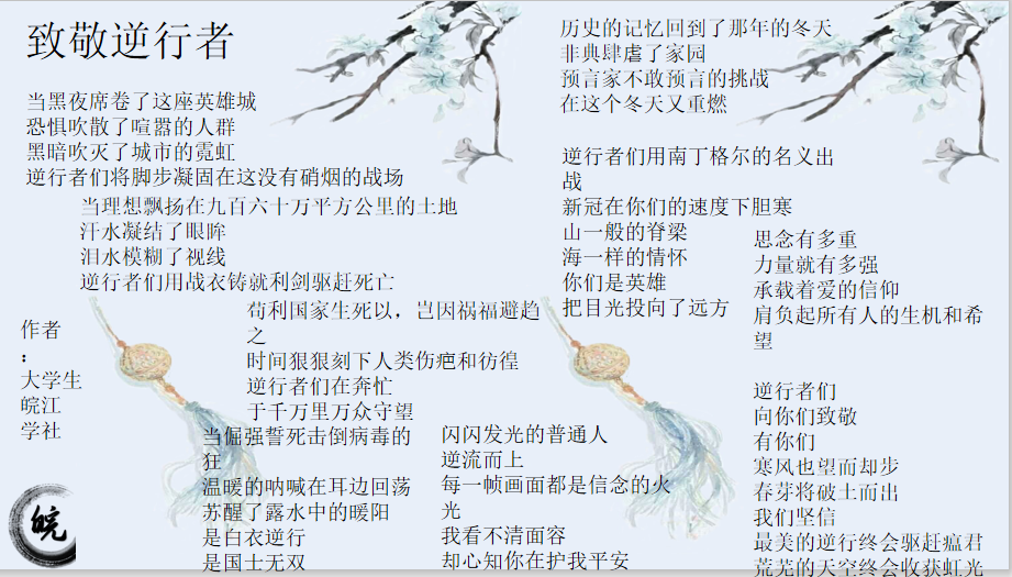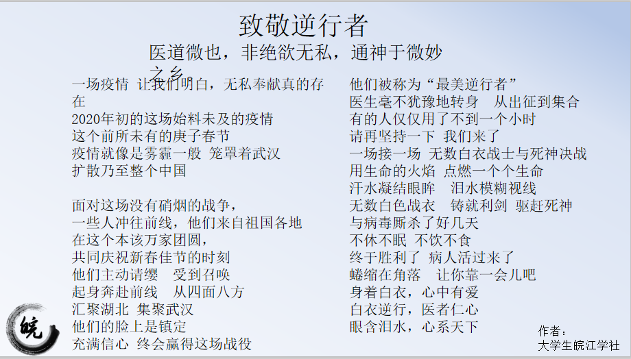“医道微也,非绝欲无私,通神于微妙之乡……”“逆行者们用南丁格尔的名义出战,新冠在你们的速度下胆寒……”为了致敬抗击疫情的工作人员们,beat365官网大学生皖江学社的成员共创作了千余字的诗词作品。2月9日,该社团在官方媒体平台上发布了由协会成员原创的诗词、手绘作品、电子海报等。