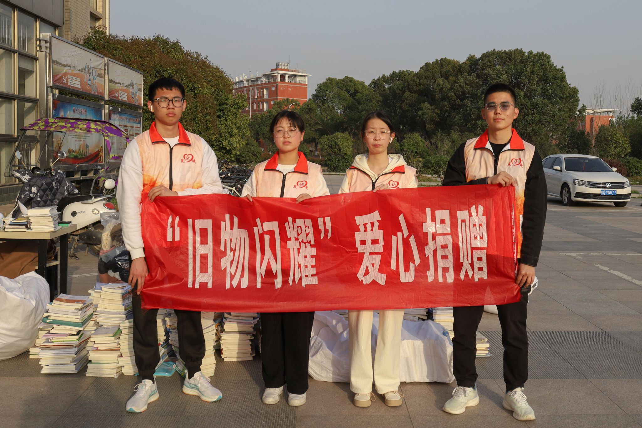 “水杯可以吗?”“这些书籍都捐赠。”……学生们拿着衣物、书籍在摊位前排起长队。熟练地从学生们的手中接过旧物,随即分类放进不同的袋子里,服务队队长吴国栋带领队员们在各个摆点处忙碌。介绍回收物品、告知活动性质、回答学生疑问……他们在现场一刻不歇。