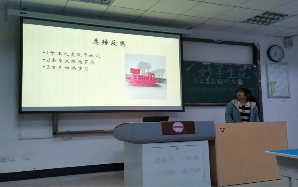 活动期间,参赛选手将自己的作品概念和蕴意以演示文稿的形式进行讲解,并同时向同学们展示手工作品。废弃的果篮、掉落的枯枝和松果,常见的快递纸盒,不起眼的冰棍……这些意想不到的原材料通过参赛选手的构思及制作变成了精美的工艺品。