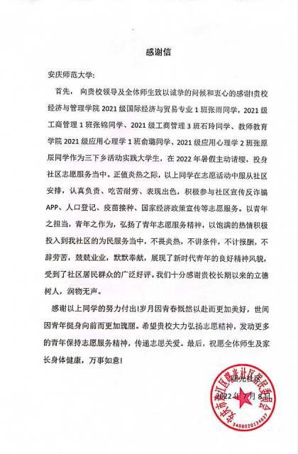“非常感谢同学们暑假期间积极参与志愿活动,为社区做了大量有效有力的辅助工作,减轻了我们的负担。”曙光社区团支部书记查媛坦言,成员们在酷暑天气执着坚守岗位,任劳任怨,行之有效完成任务的态度深深打动了她。“能扛得住、拿得下如此繁重的任务,从他们身上,我深刻感受到了当代大学生不怕吃苦、勇于担当的向上精神。”实践团杰出的表现被社区一一“签收”,收到了社区干部及居民群众的一众好评。