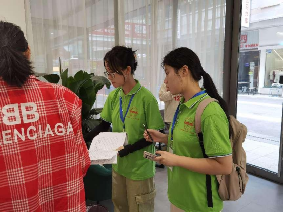 统计商户店铺信息、拍摄记录营业执照、宣传迎江区商业政策、统计国家反诈app下载情况……在吾悦金街的每间商户都留下了成员们忙碌的身影。在37度的高温下,汗水打湿了一件件“小绿衣”,调研的“接力棒”却不曾停止。