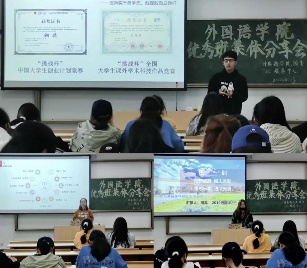 为进一步发挥优秀班集体的引领示范作用,提升班级凝聚力,引导班级明确创建目标和发展方向,4月13日,外国语学院举办优秀班集体分享会,特邀请2021年度校十佳班集体2018级英语1班、先进班集体2019级商务英语1班、2019级翻译2班的班委们分享经验,2021级全体班委到场聆听。