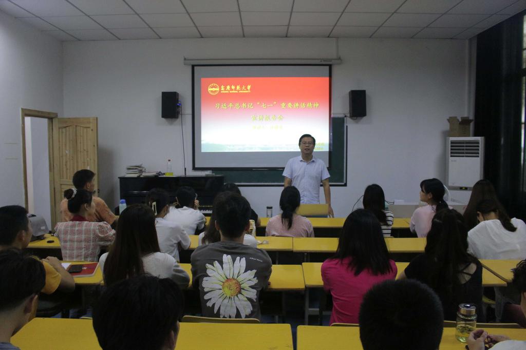 9月22日,黄梅剧艺术学院直属党支部书记汪博武在菱湖校区小红楼102室为学院学生代表作学习贯彻习近平总书记“七一”重要讲话精神专题宣讲报告。2019级、2020级全体学生参加了报告会。