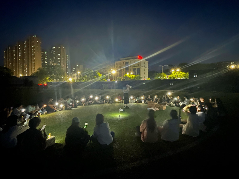 为丰富学生们的在校生活,缓解疫情给学生们带来的心理压力和紧张情绪,中国语言文学类专业2021级(6)班精心策划本次班级团建,活动负责人之一郑美君为了鼓励学生们积极参与,用班级费用准备了一些比赛奖品,如小零食、本子、百乐笔等。此次团建分为节目表演、心理趣味游戏和合唱歌曲三个部分,活动形式多样、内容丰富、趣味横生。活动过程中,五十余名学生们在操场上围成一个圈,打开手机闪光灯,轻轻挥动着手臂,照亮了昏暗的夜空。