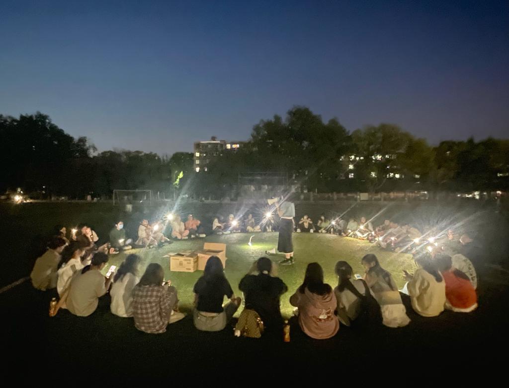 在团建的尾声,全班学生合唱《后来》将整个活动推向高潮,动听的歌声在夜空中久久回荡。“疫情封校期间,心情还是比较沉闷的,这个活动开展得很及时,缓解了疫情带来的紧张情绪”学生史欣瑶坦言,大家在操场上围坐在一起,有家的感觉,让自己感觉很温暖。