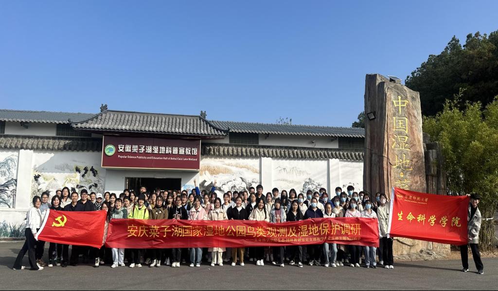 11月20日,生命科学学院生态教研室党支部、学生党支部联合学院生态俱乐部,带领部分入党积极分子和大一新生前往安庆市菜子湖国家湿地公园进行湿地鸟类观赏和生态环境问题调研活动。