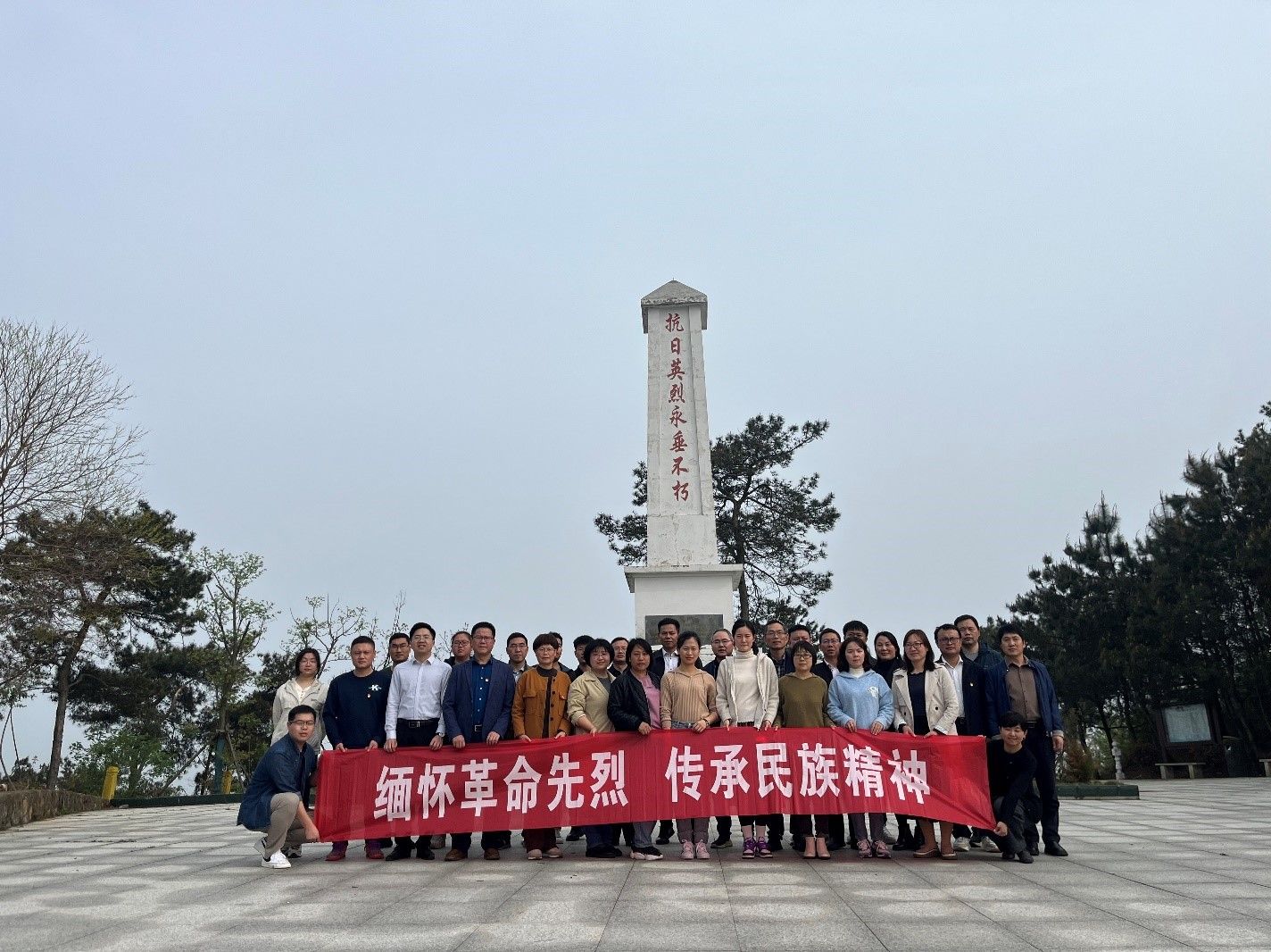 在桐城市大横山烈士陵园,全体人员向抗日英烈肃立默哀并三鞠躬。全体人员缓步绕行,共同瞻仰了抗日英烈纪念碑,表达对抗日英烈的缅怀和崇敬之情。