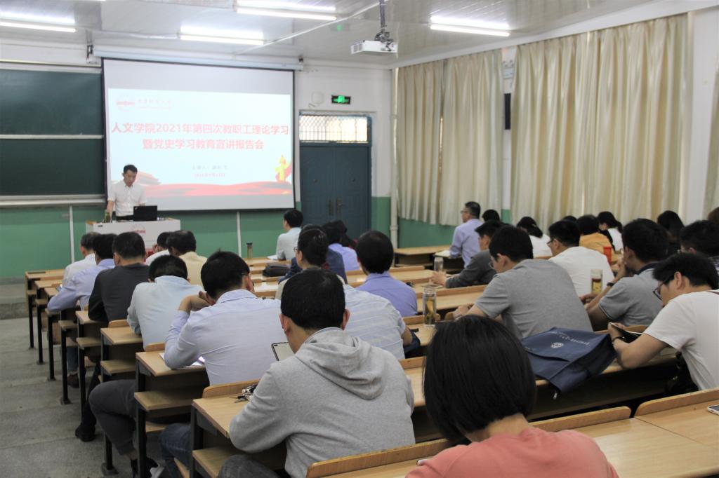 5月12日,人文学院举办2021年第4次教职工政治理论学习暨党史学习教育宣讲报告会。人文学院党委书记、校党史学习教育宣讲团成员张红飞作专题报告,领导班子成员和全体教职工参加会议。